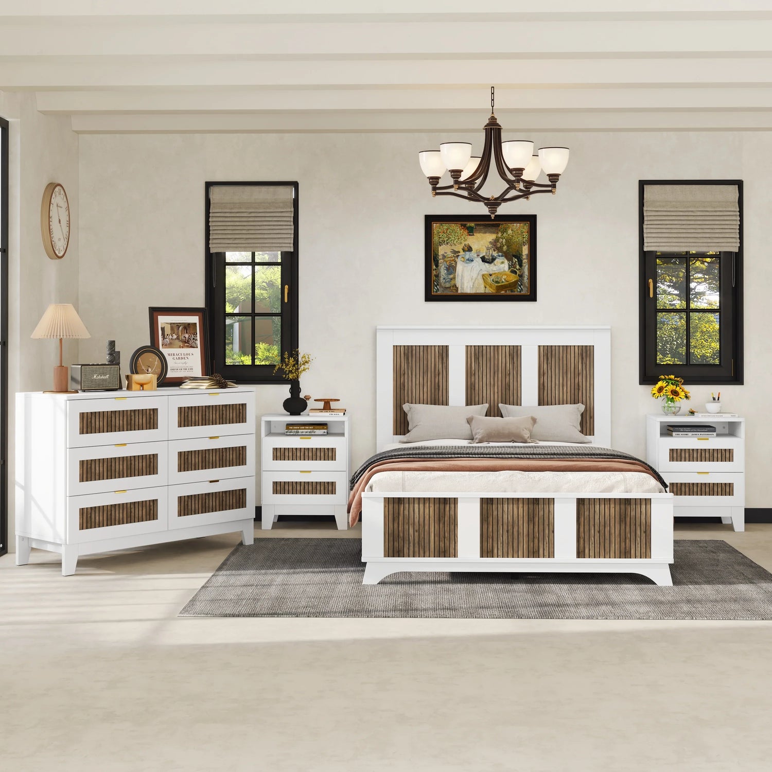 Built with a white painted frame and warm, vertically slatted wood-panel accents on the headboard, footboard, dresser and nightstands, this bedroom collection blends crisp white surfaces with natural wood texture for a contemporary-rustic feel. Hardware details in a warm metallic tone and slightly tapered legs give the set a light, elevated profile that’s easy to style with linen bedding, woven rugs, or minimalist décor.