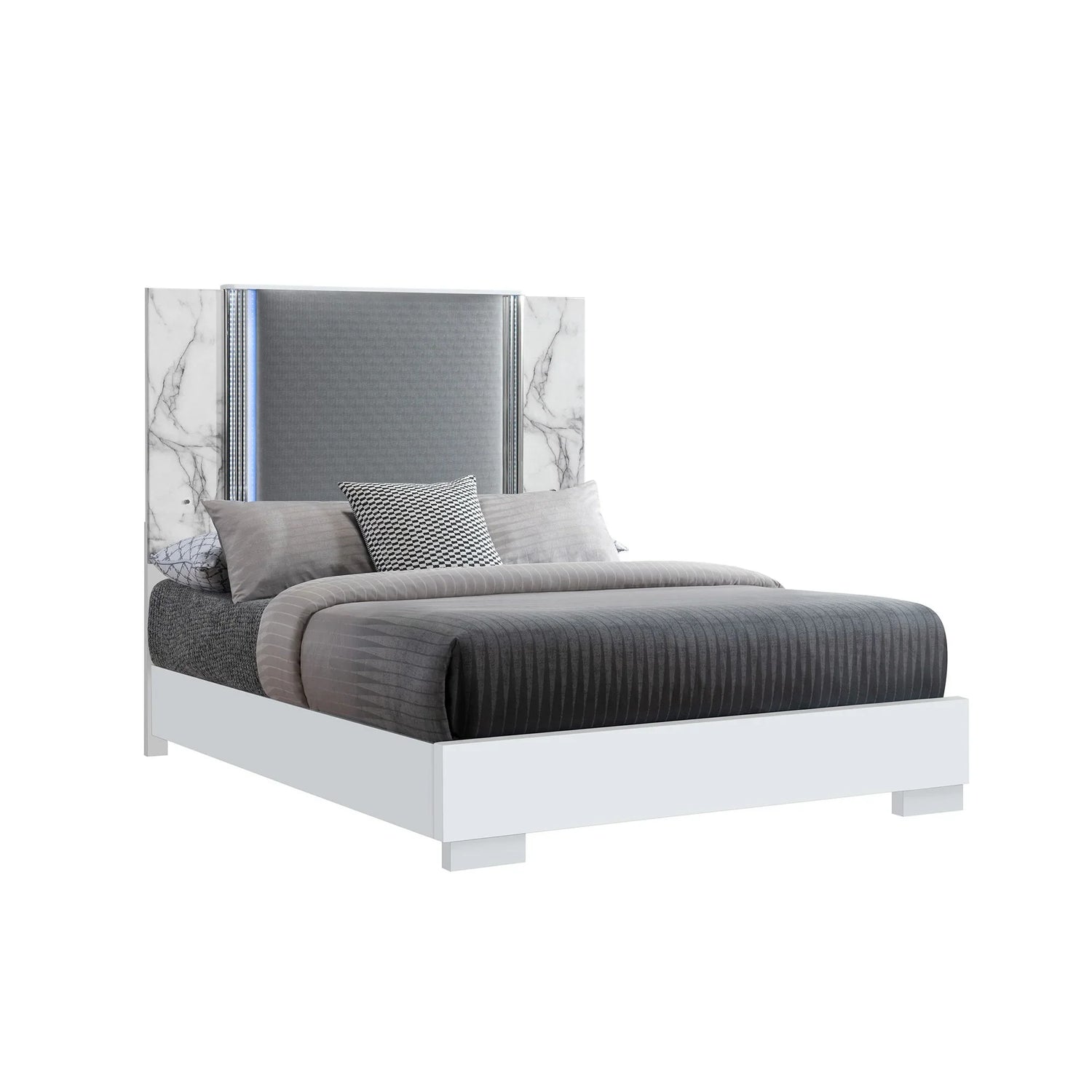 - Finish & color notes: White low‑profile frame with marble‑look side panels and medium‑gray upholstered headboard; chrome trim adds a subtle reflective accent. Natural variation in veneer grain and fabric texture is expected—screens may vary from real material.