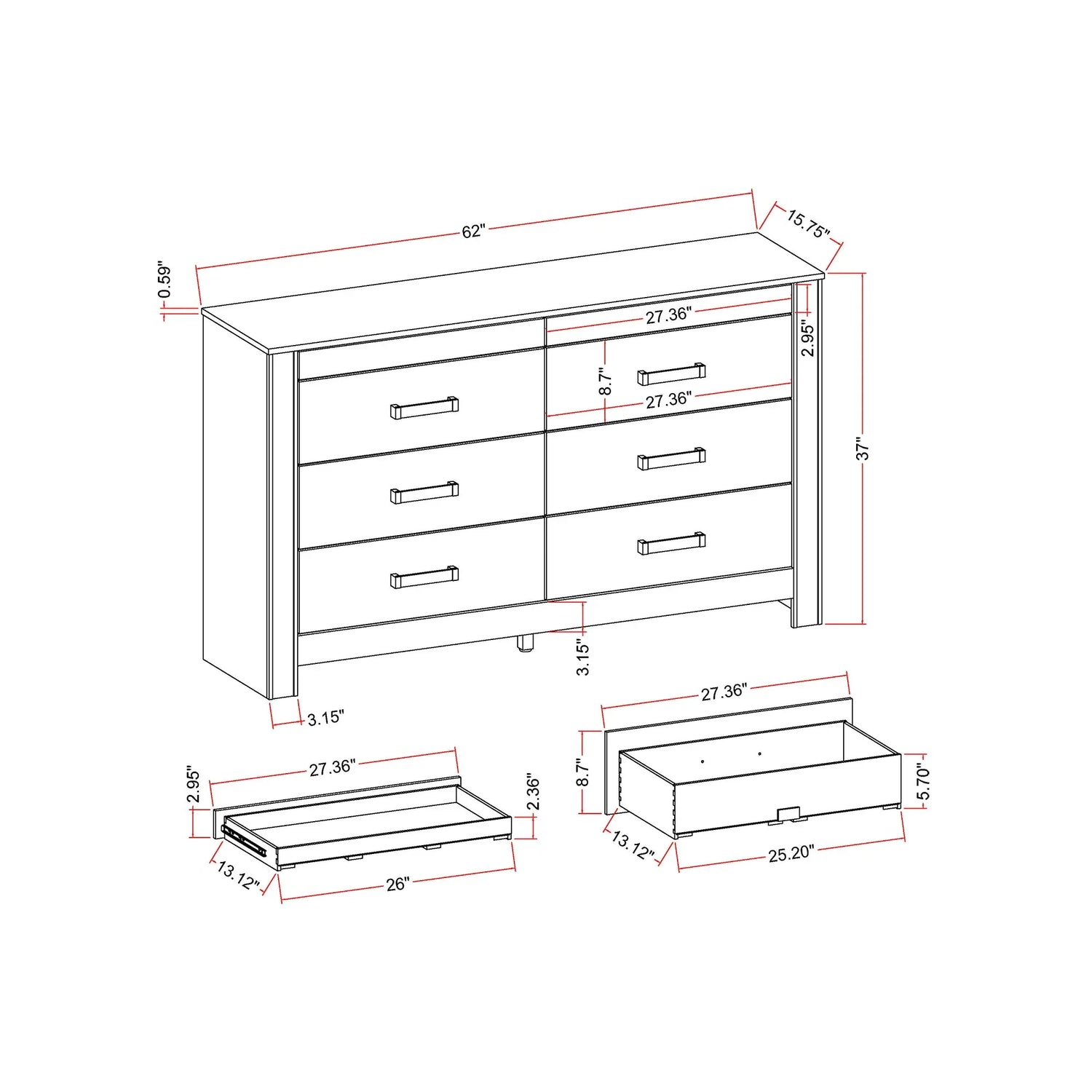 - Acrylic Bar Handle Design: Adds a contemporary touch to the dresser's overall aesthetic.