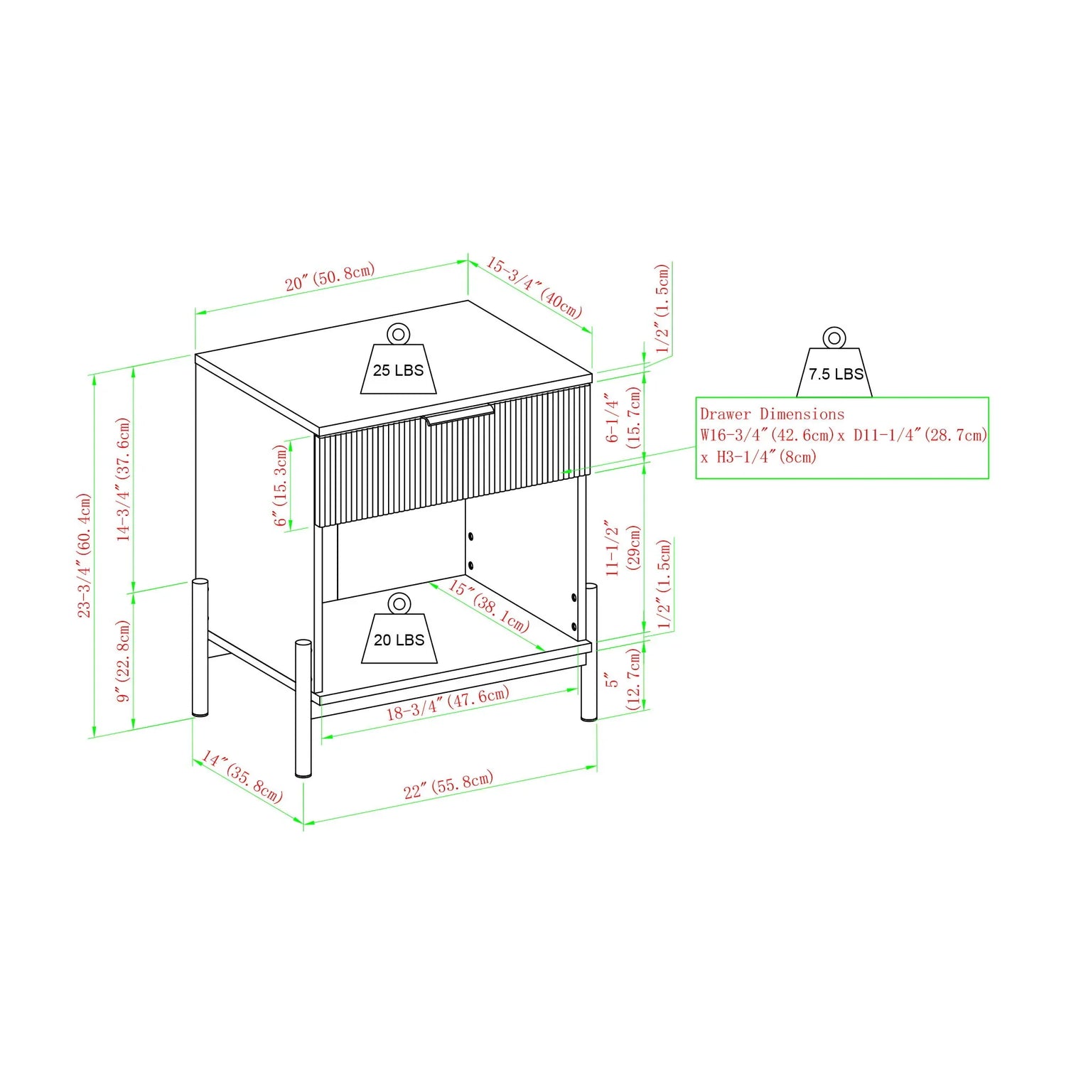 - Storage: Single fluted front drawer for concealed storage plus open cubby for books or decorative items.