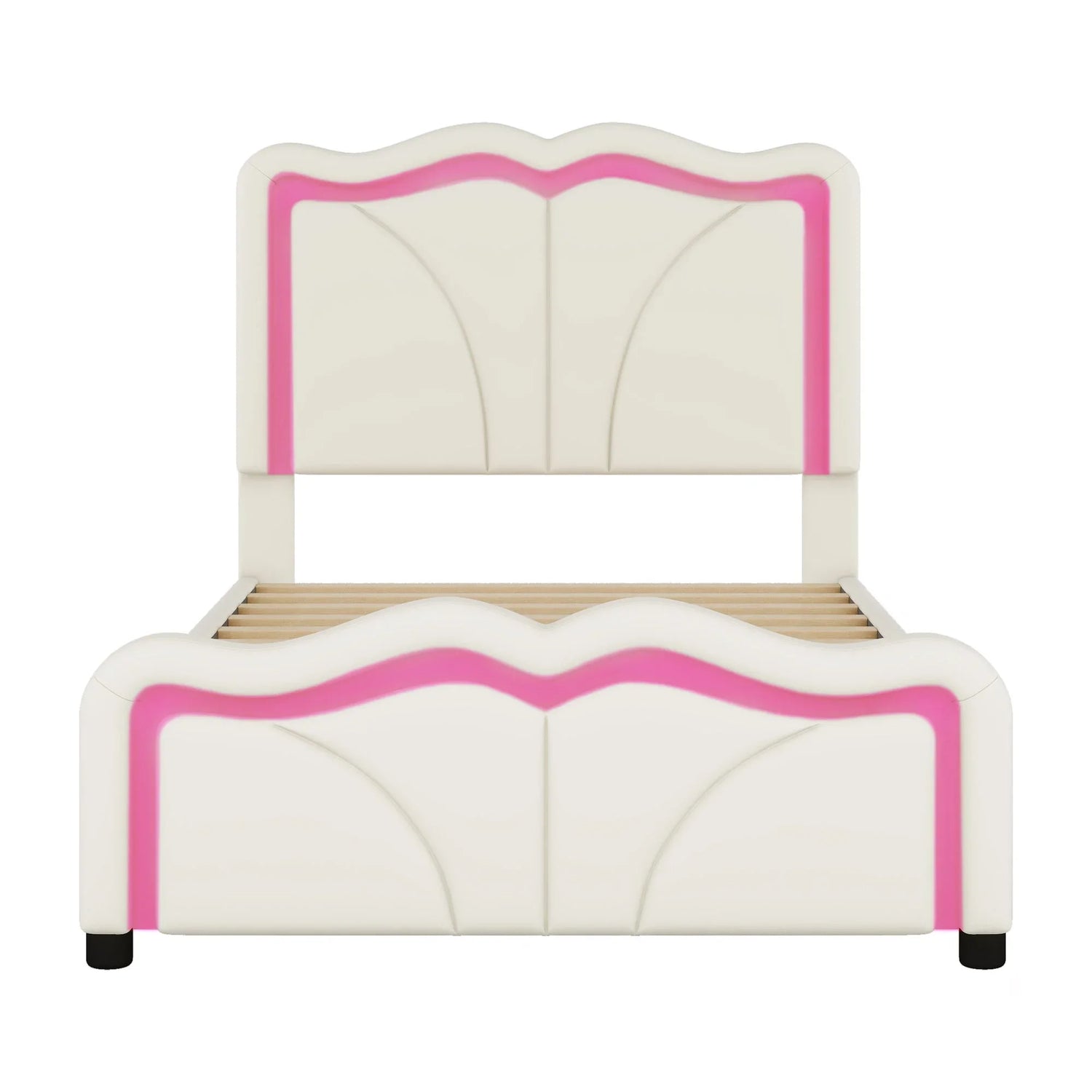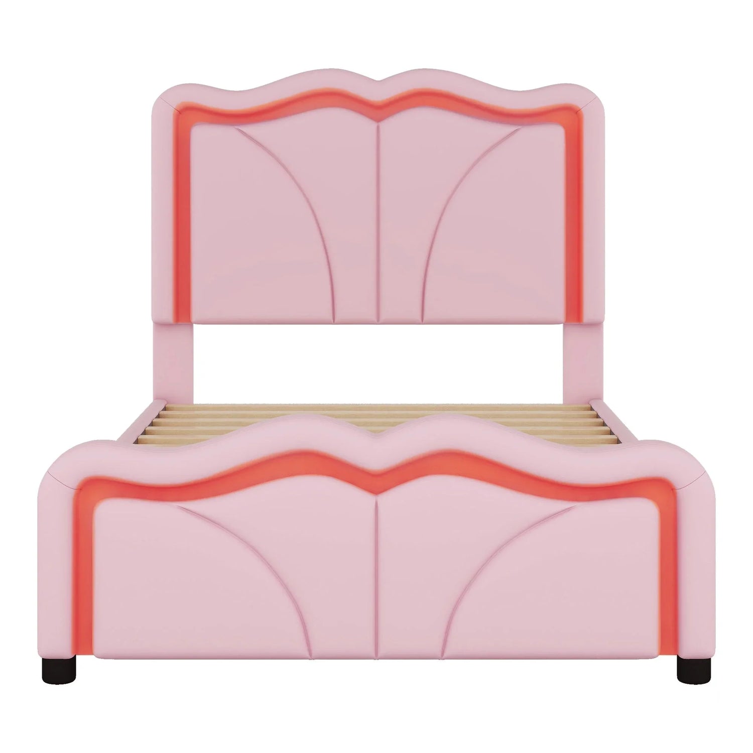Twin Size Upholstered Platform Bed & Curve Shaped And Height Adjustable Headboard, LED Light Strips - Pink