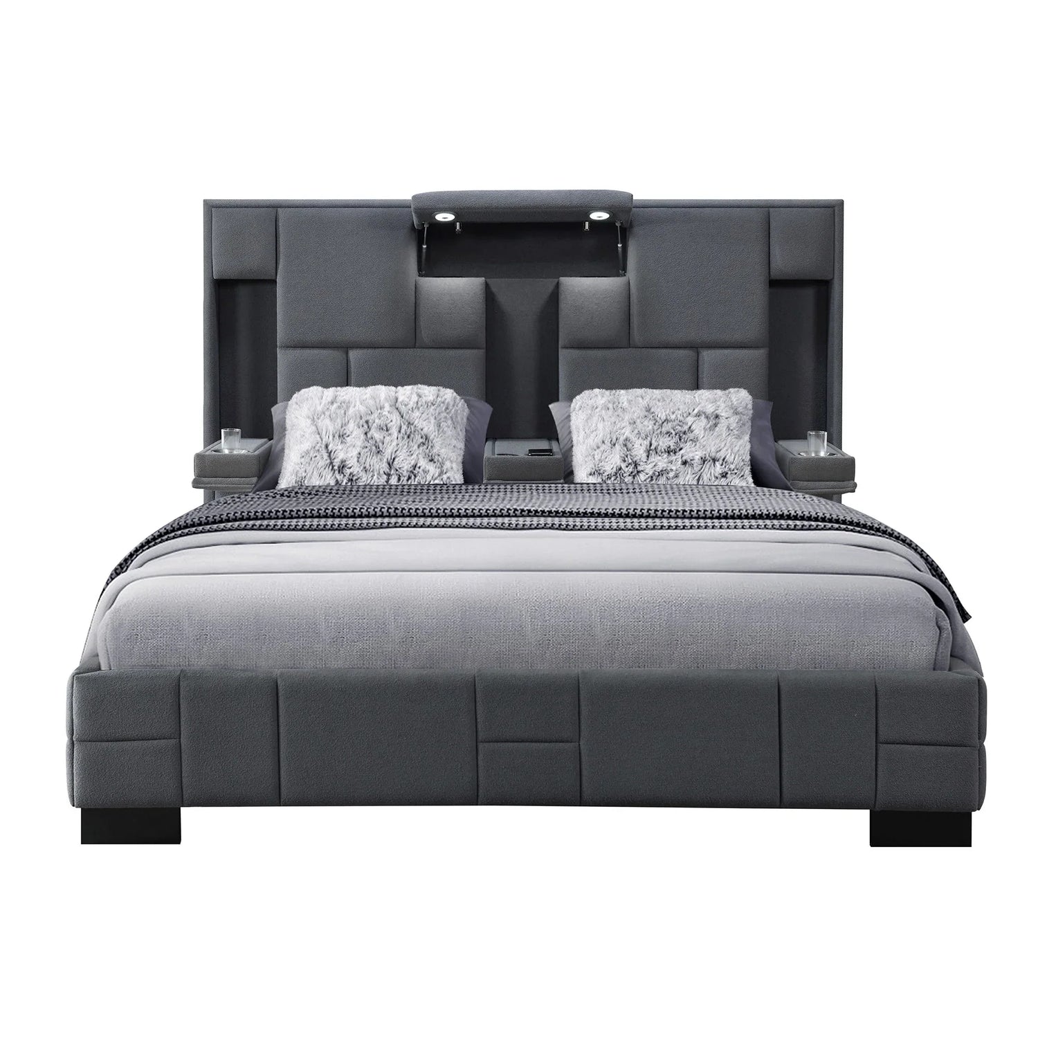 Day-to-day use centers on convenience: a central fold-up armrest hides a wireless charging surface and two integrated LED reading lights, while discreet built-in speakers let you cue morning playlists or sleep sounds without extra gear. The frame reads as low and grounded in photos—thick upholstered rails, square block feet and a tightly tailored finish—so it fits both contemporary and transitional interiors. Note: natural fabric texture and screen color may vary slightly in person.