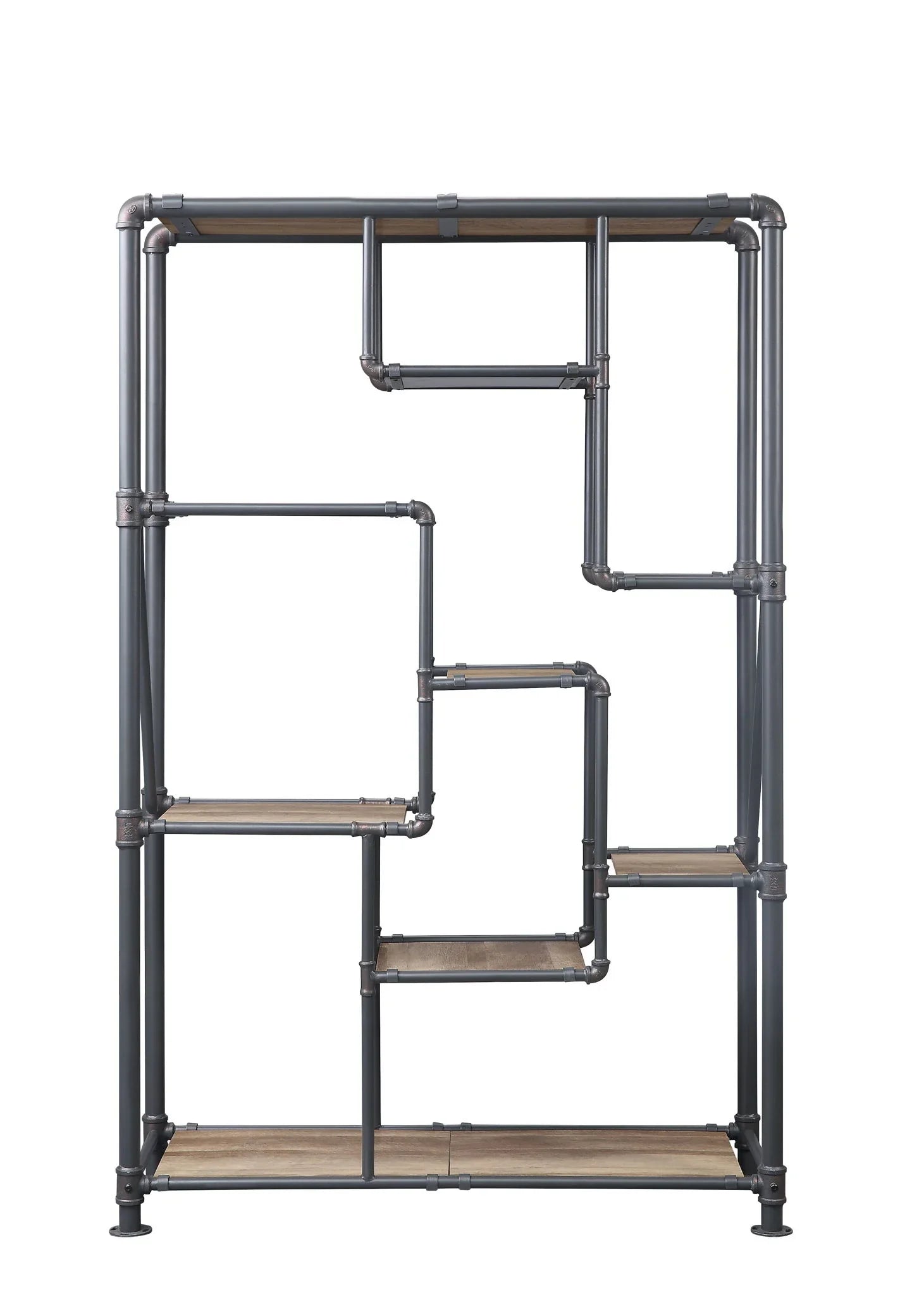- Industrial + warm aesthetic: Pipe-style metalwork paired with antique oak-tone shelves balances rugged structure with soft wood grain.