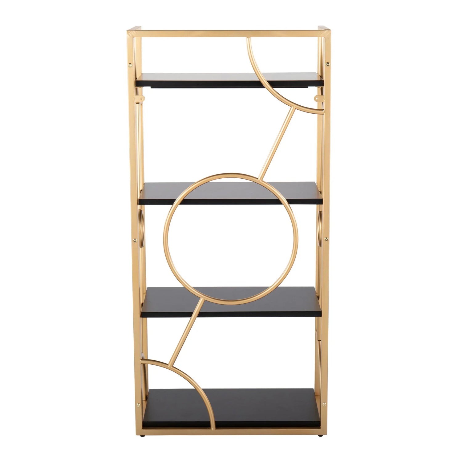 Finish & color: Warm gold metal frame with black wood shelves. The gold has a satin metallic appearance and the black shelves read as deep charcoal/black. Natural lighting and screens may show slight variation in tone and texture.