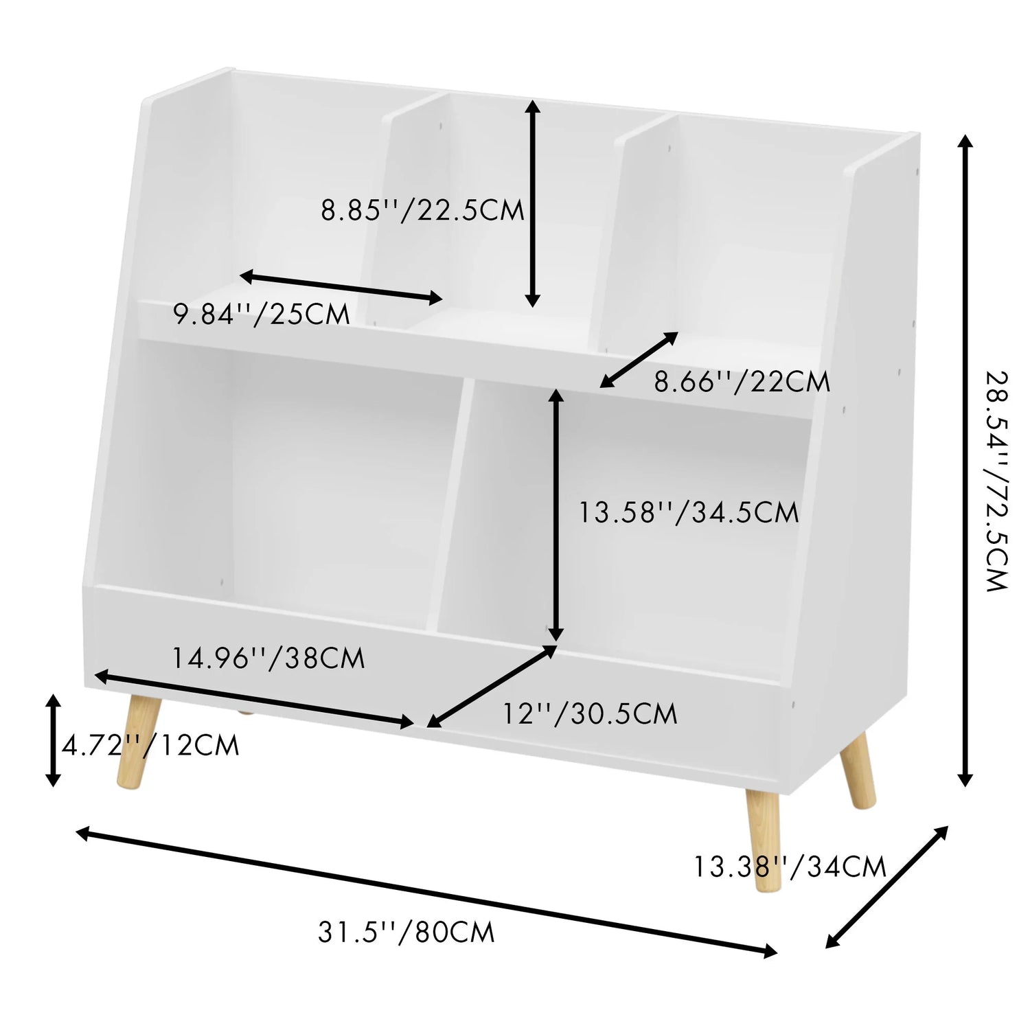 Kids Bookshelf And Toy Organizer, 5 Cubbies Wooden Open Bookcase, 2-Tier Baby Storage Display Organizer With Legs, Free Standing For Playing Room, Bedroom, Nursery, Classroom - White