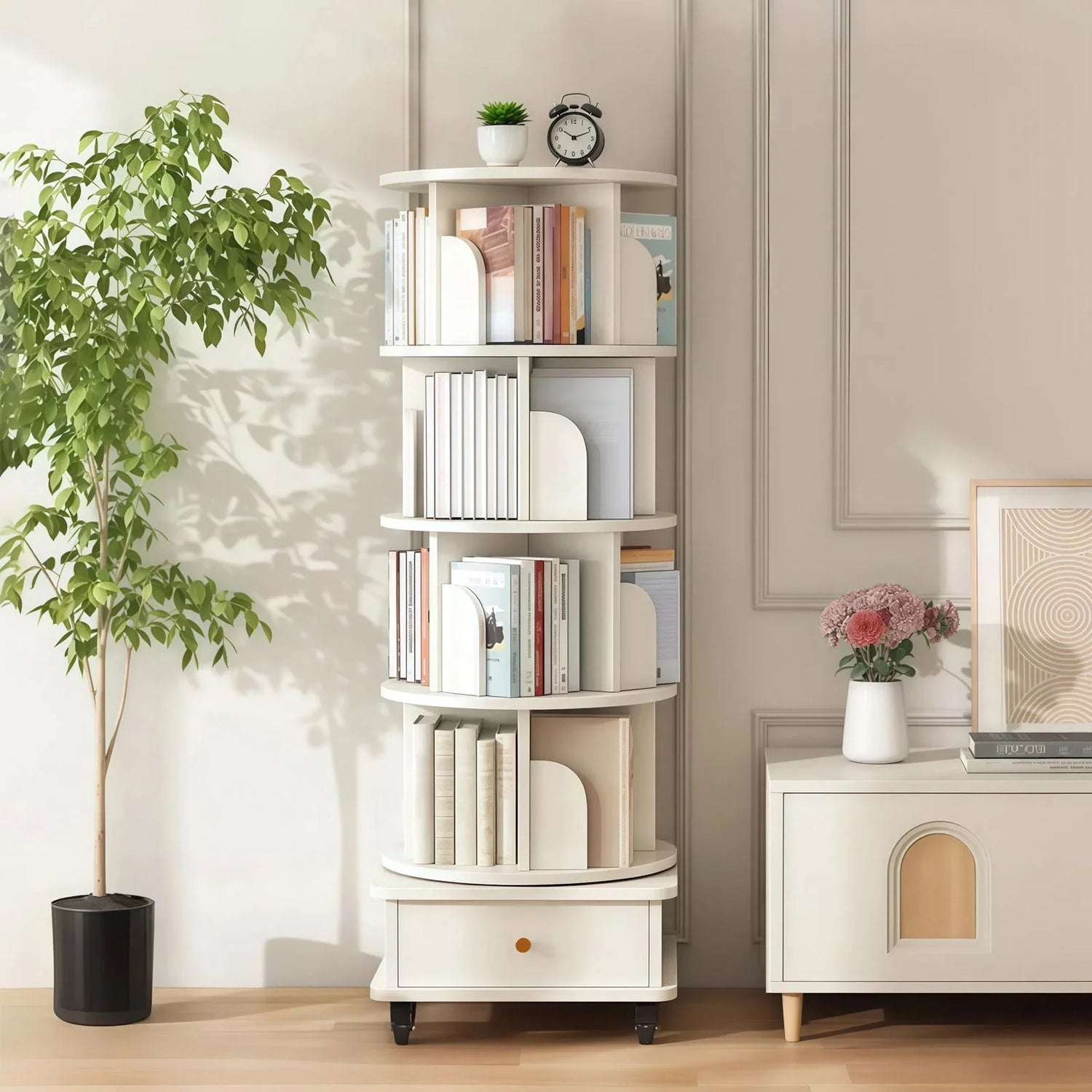 5 Tier Rotating Bookshelf With Wheels And Drawer, 360° Spinning Design, Space Saving Storage, For Home And Office - White