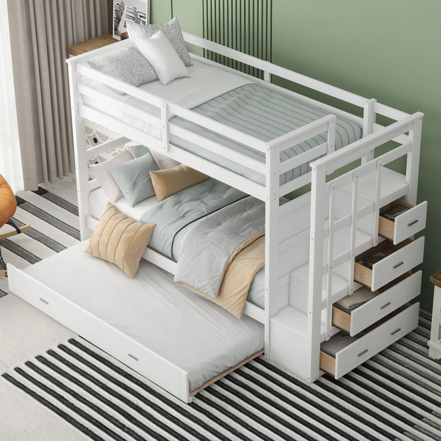 Twin Over Twin Bunk Bed With Trundle And Staircase - White