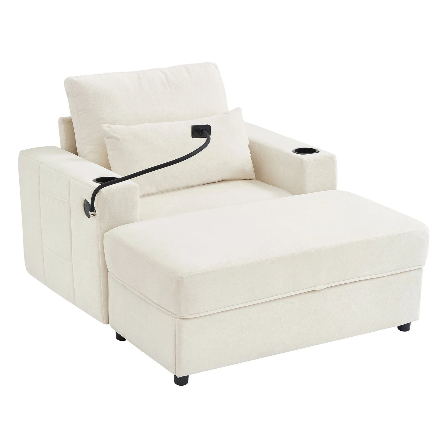 Modern Style Armchair Chaise Lounge Sofa Couch With Movable Storage Ottoman, USB Ports, Cup Holders, Phone Holder Chenille - Beige