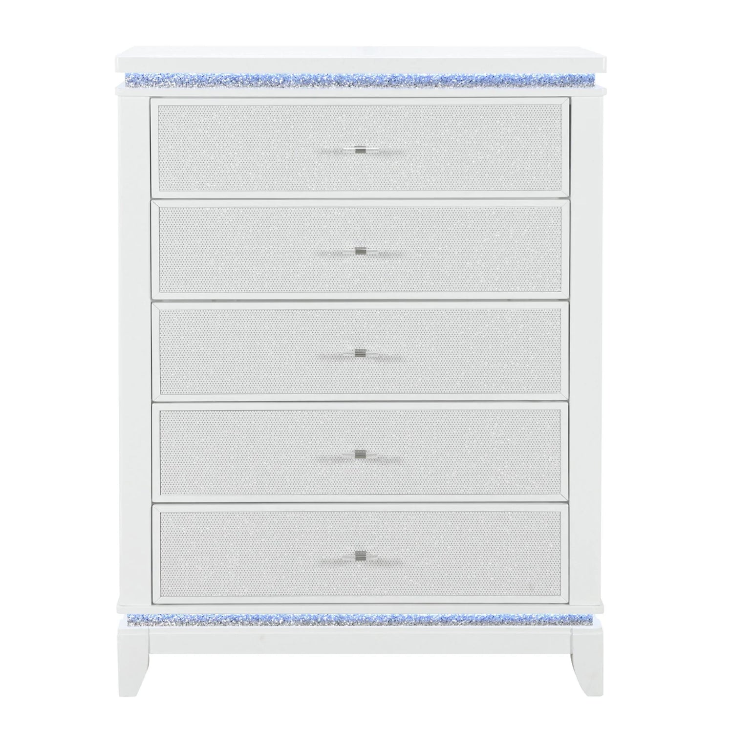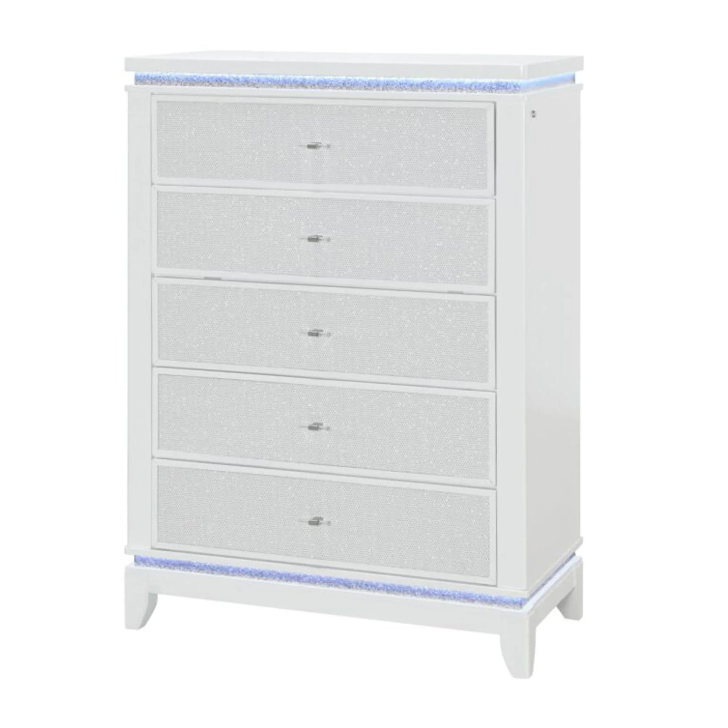 Perfect for a contemporary bedroom, the Adalid Chest with LED Lighting - White is designed for shoppers who want clean lines plus a bit of sparkle. Its tall, five-drawer layout fits beside a bed or in a dressing area to keep clothing and accessories organized while making a modern, glamorous statement.