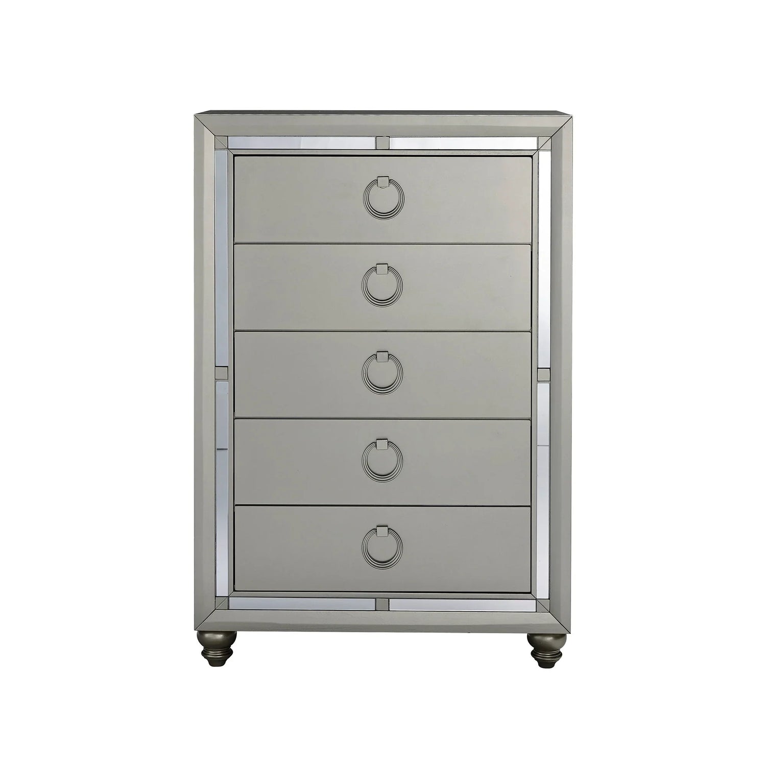 Everyday use is effortless: five roomy drawers with center metal glides pull smoothly for organized clothing and bedside essentials, while classic bun feet and ring‑pull hardware keep the look timeless. Built from solid‑wood construction with mirrored accents, this chest blends durable build quality with a refined, decorative finish that elevates modern and transitional interiors alike. Note: natural finishes and mirrored details may show subtle variation in person.