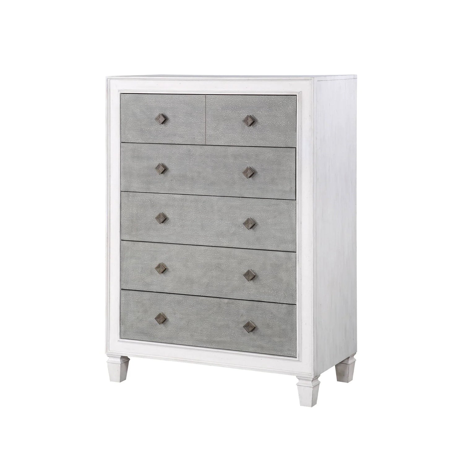 Perfect for someone who wants timeless style with everyday function, the Katia Weathered Chest—White brings transitional elegance to a bedroom or dressing area. Its clean, framed silhouette and weathered gray drawer fronts balance classic lines with a softly aged finish, making it easy to pair with both modern and traditional decor. Designed for daily use, it works well as a primary dresser in a smaller bedroom or as a statement accent chest in a guest room or entry.