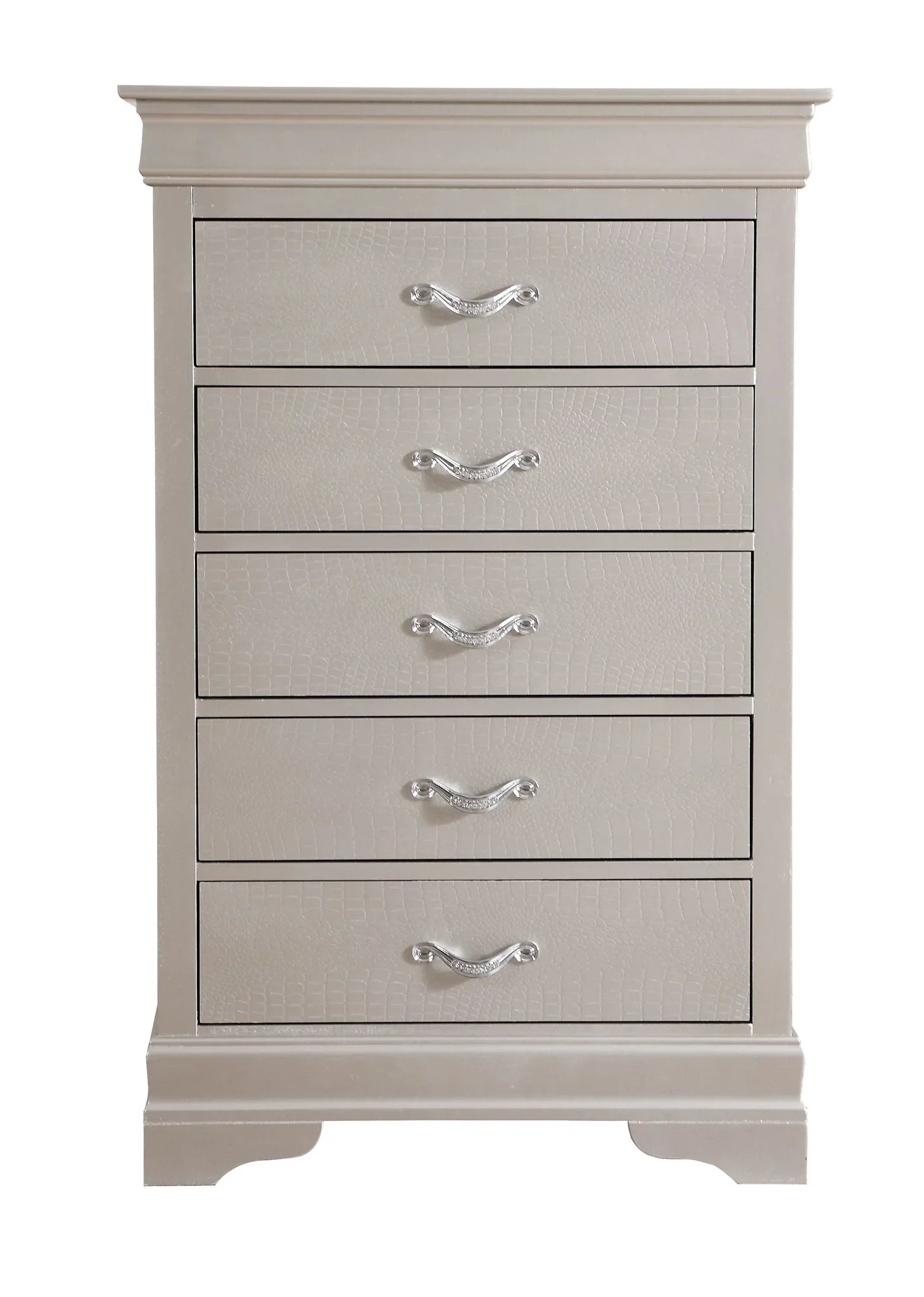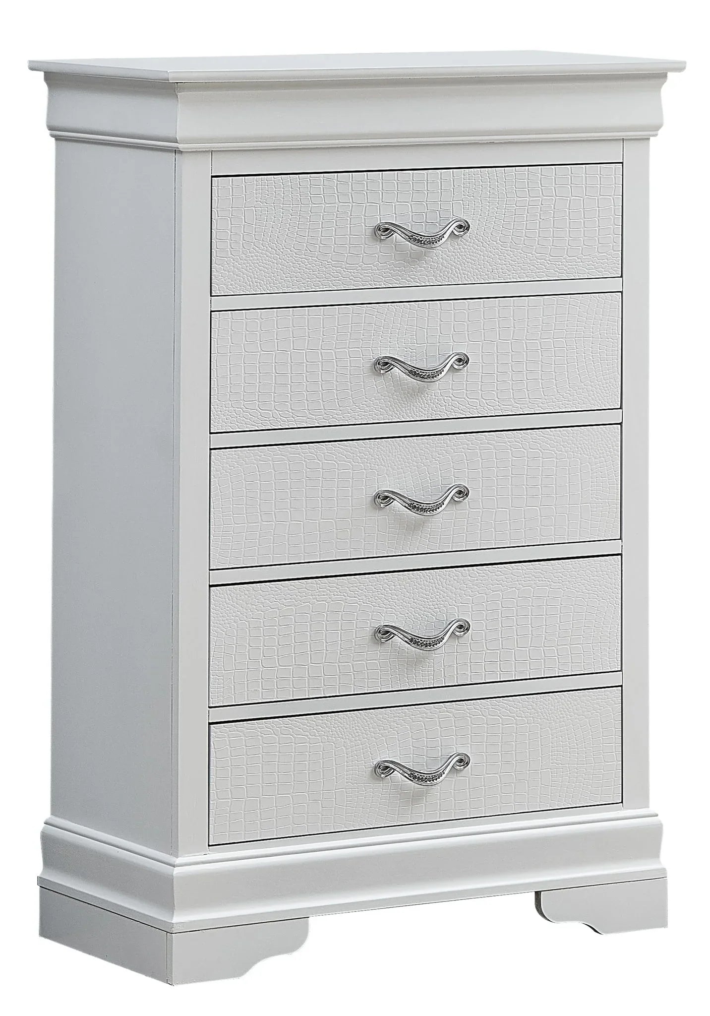 Day-to-day, this chest works as a practical clothing and linen organizer while elevating a room with its embossed textured drawer fronts and chrome pulls set with faux crystals. The piece ships fully assembled from the factory, so it’s ready to use right out of the box and presents clean, finished lines from every angle.