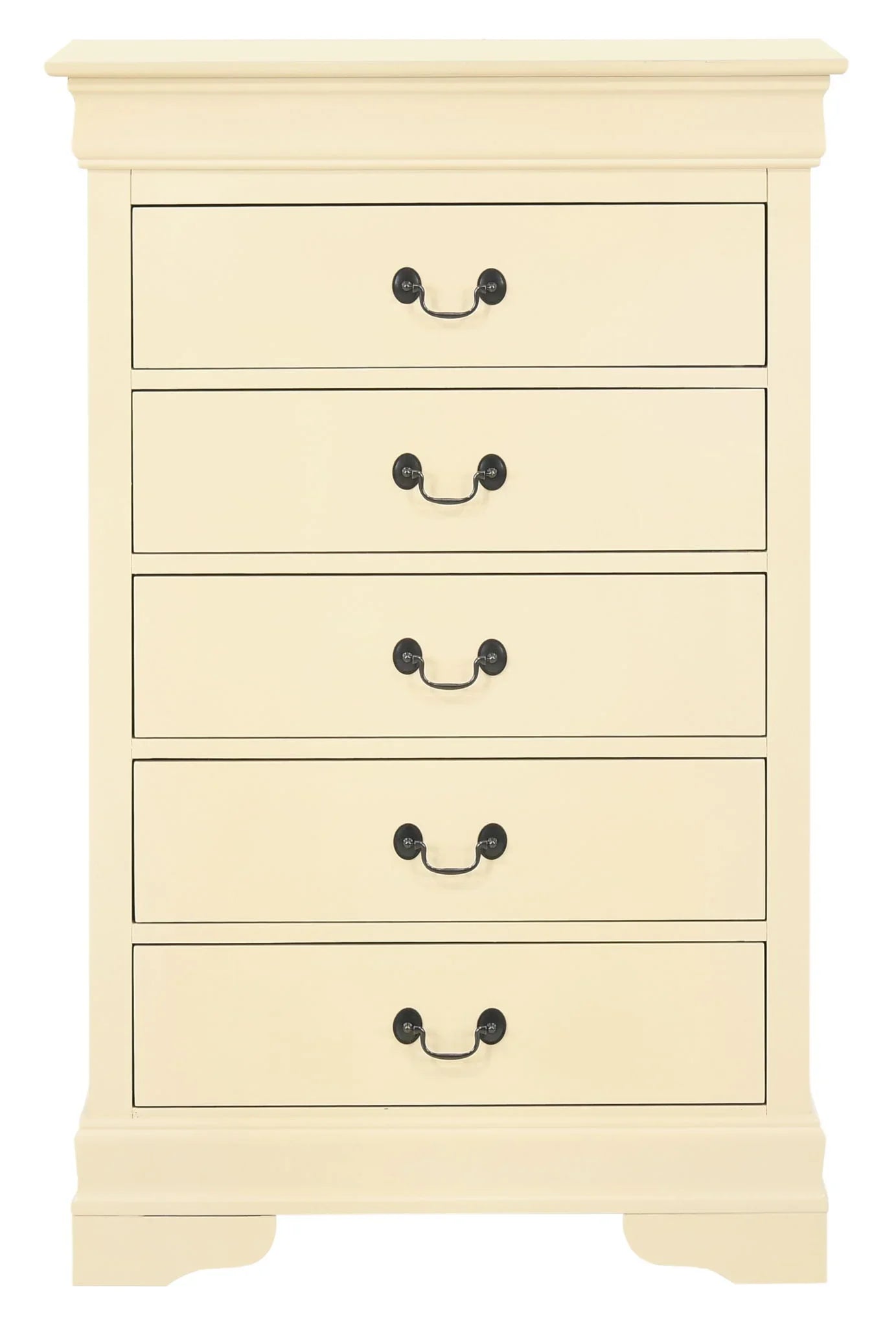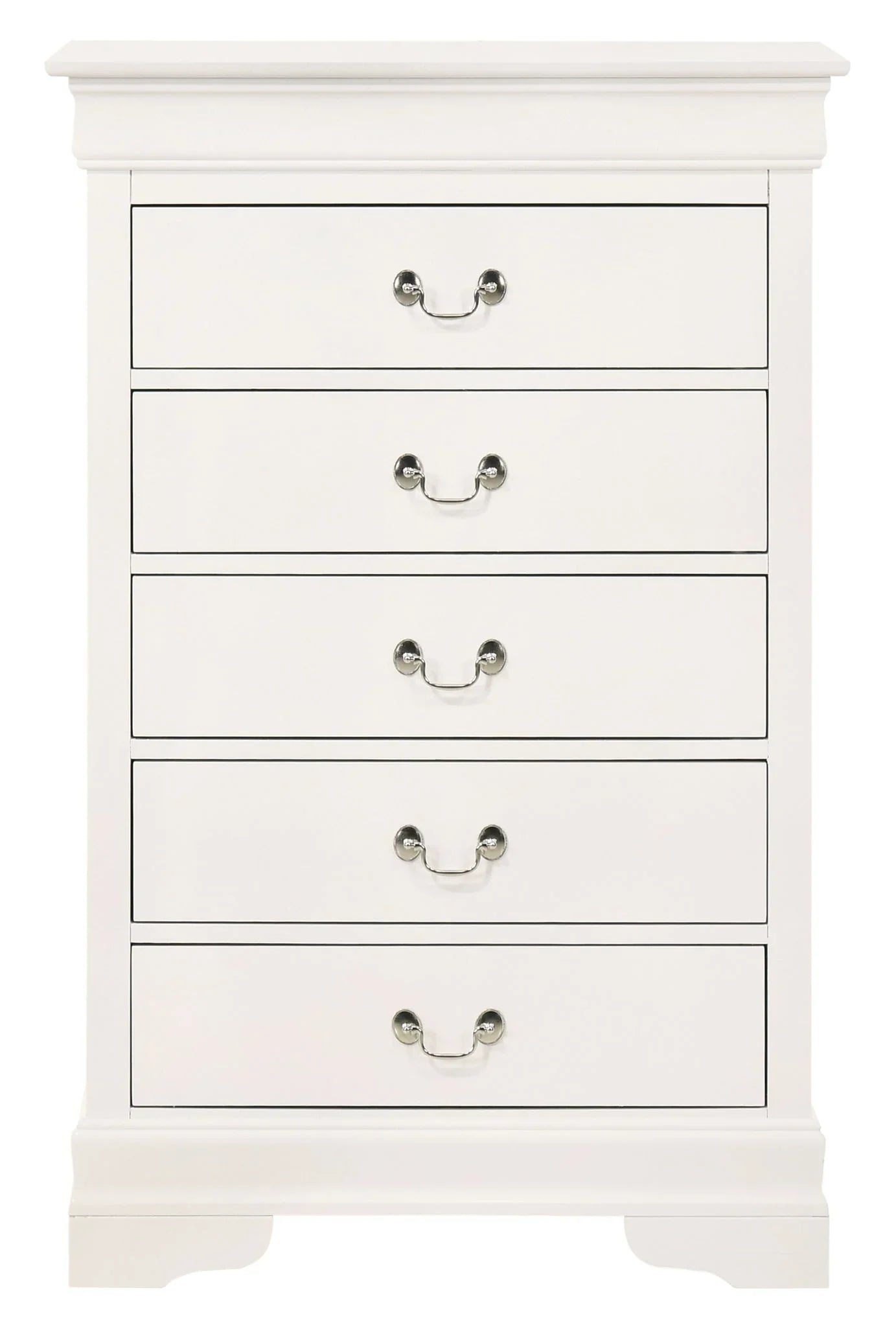 Everyday use is simple and secure: five deep drawers glide on metal center guides with positive stops and English-dovetailed construction for long-lasting strength. Polished metal bail pulls and what appears to be a tarnish-resistant finish deliver a subtle, upscale contrast to the painted case. Fully assembled out of the box, this chest is ready to hold folded clothes, linens, and seasonal items with confidence.