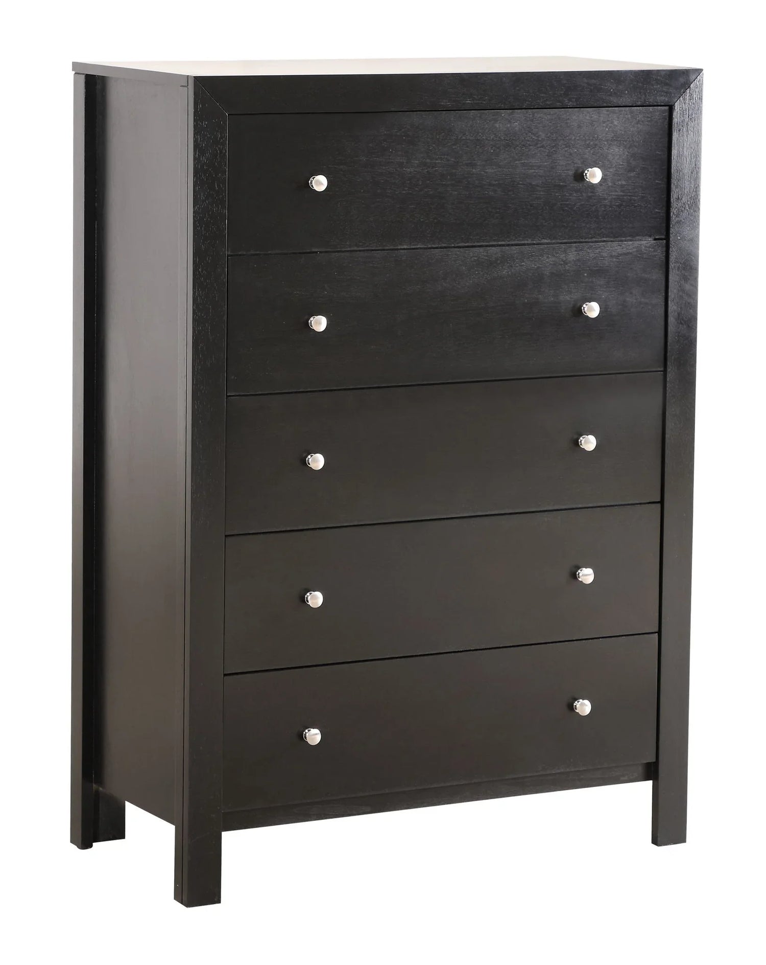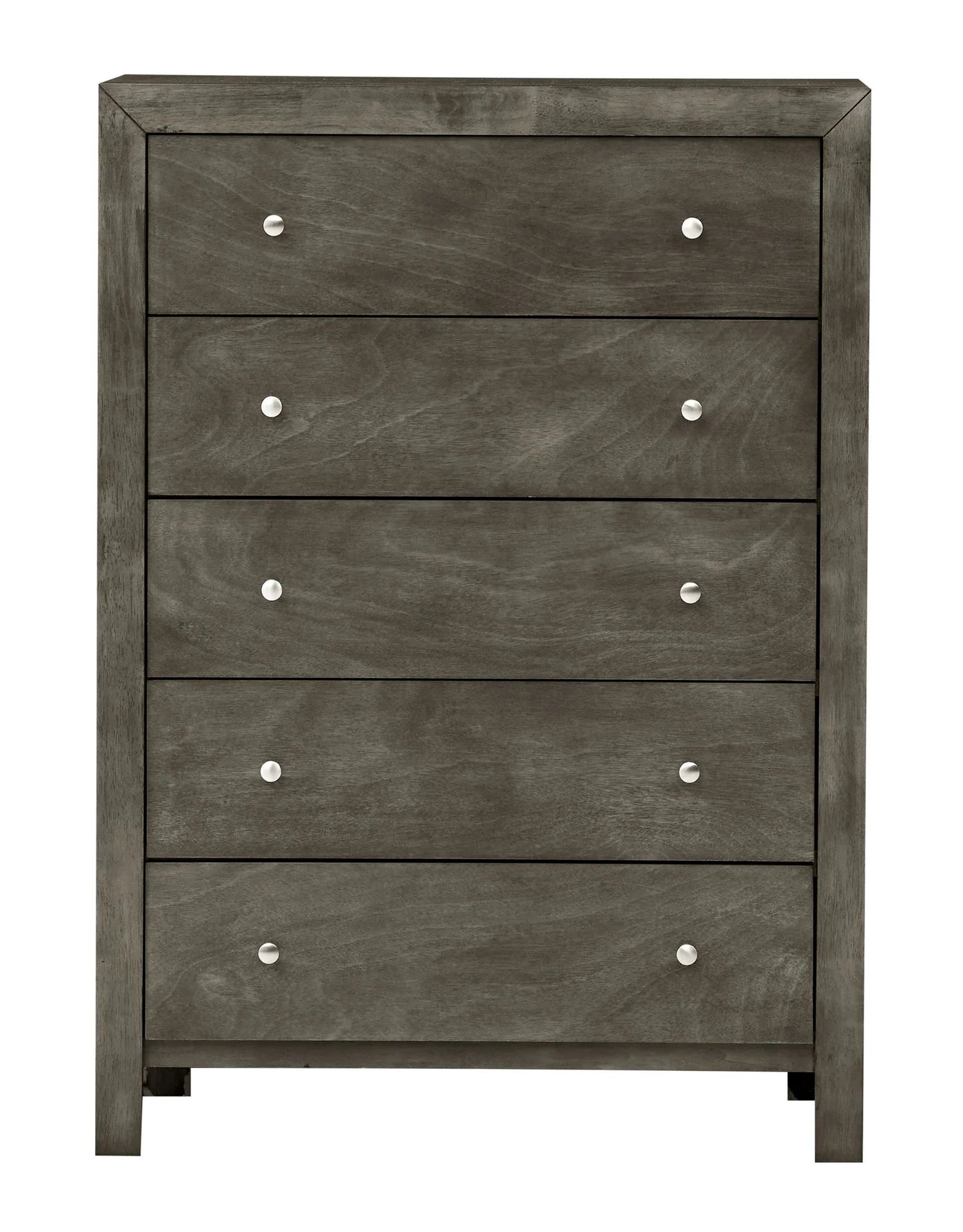 Designed for everyday use, the chest features five deep drawers with simple round metal knobs and a warm gray wood veneer finish that lets natural grain show through. Built from wood veneers and manufactured wood, it arrives fully assembled so you can place it and start using it right away—no tools or setup required.