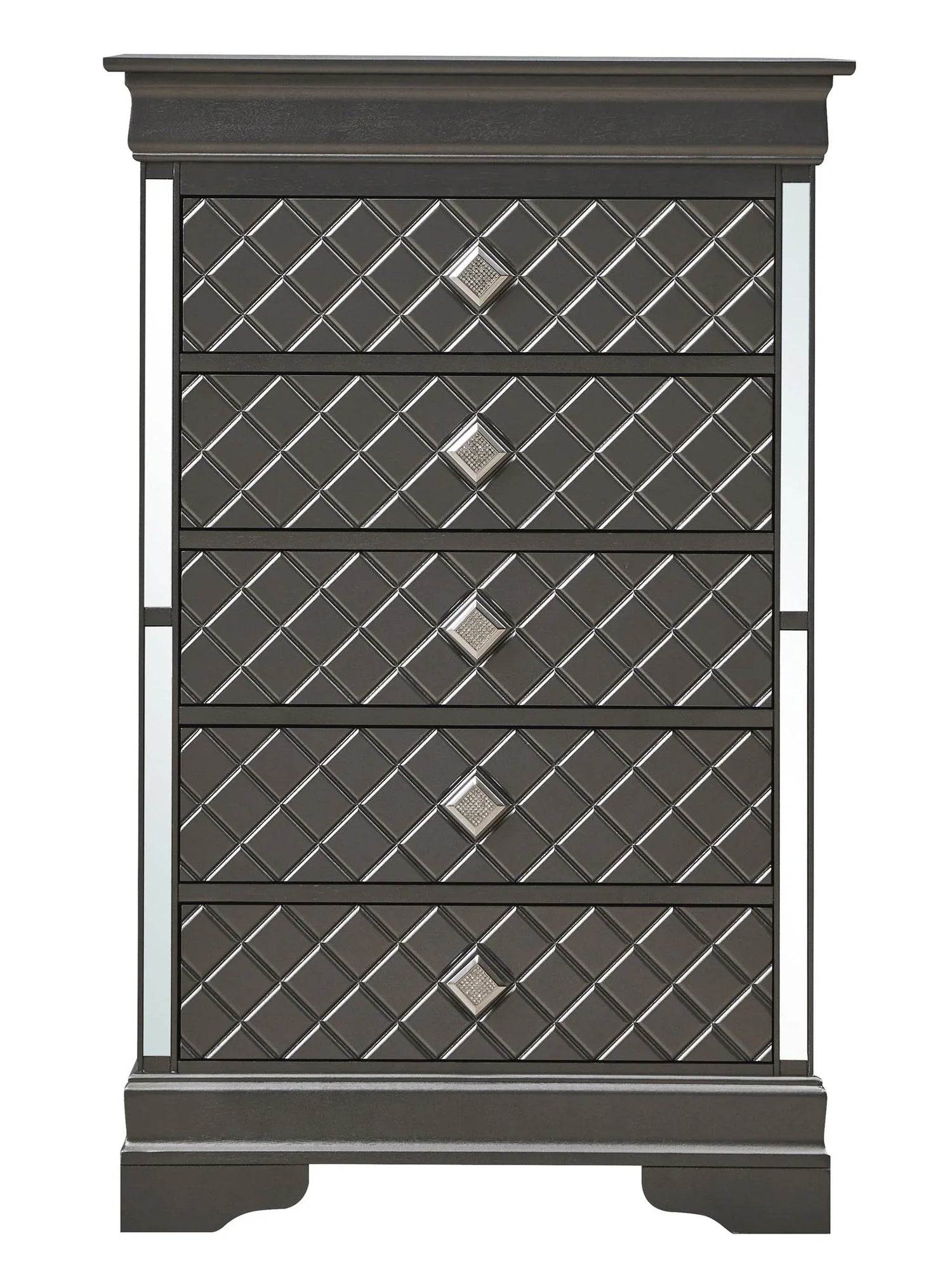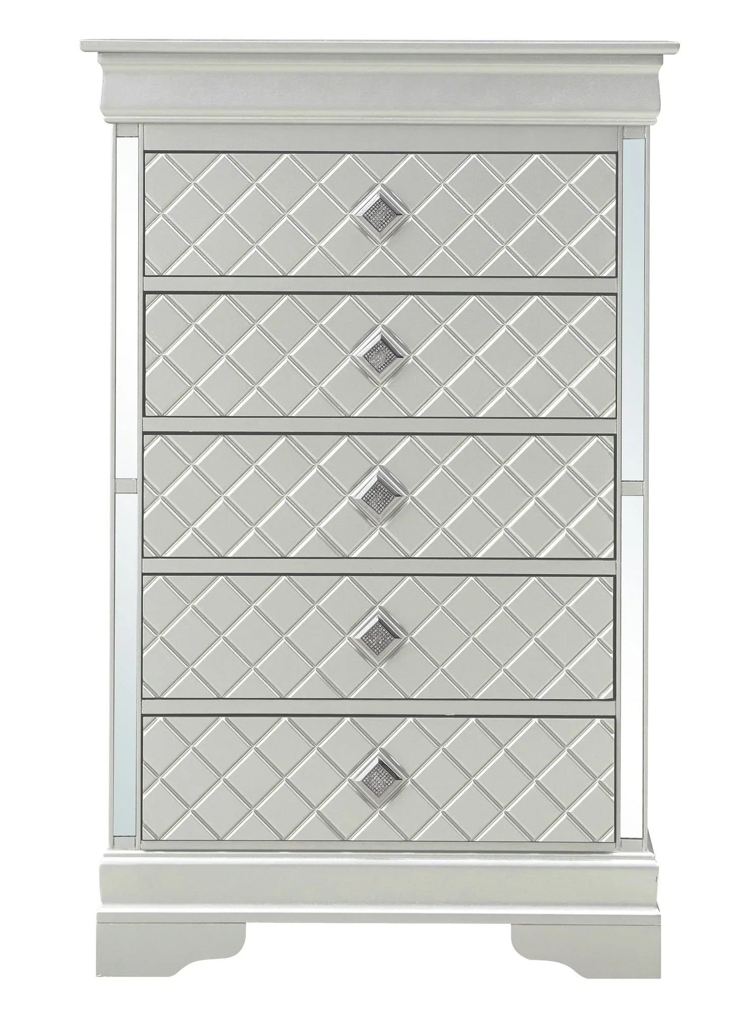 - Embossed "X" Design: Silver Champagne embossed "X" design on wood veneers for a stylish bedroom group highlight.