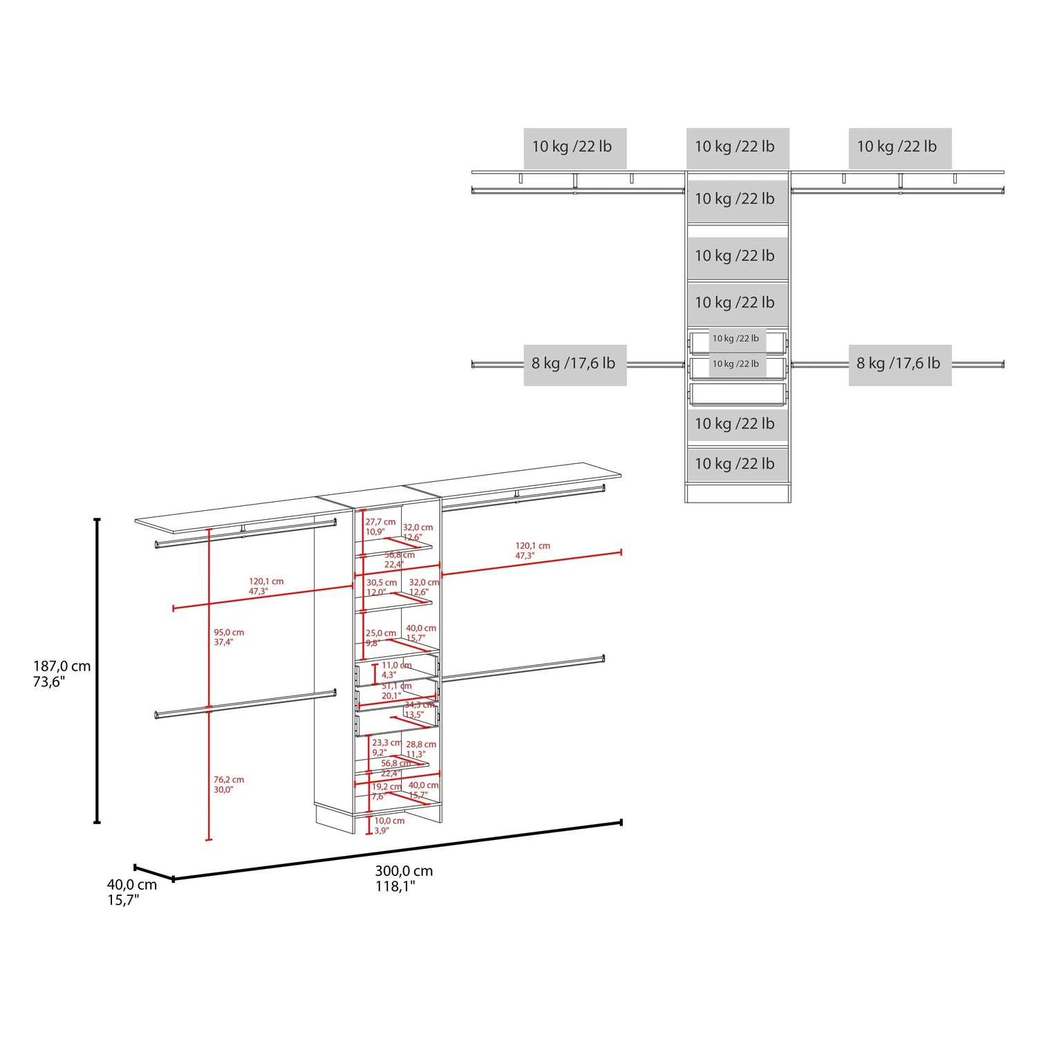 Dimensions | 73.6 inches high x 118.1 inches wide x 15.7 inches deep |