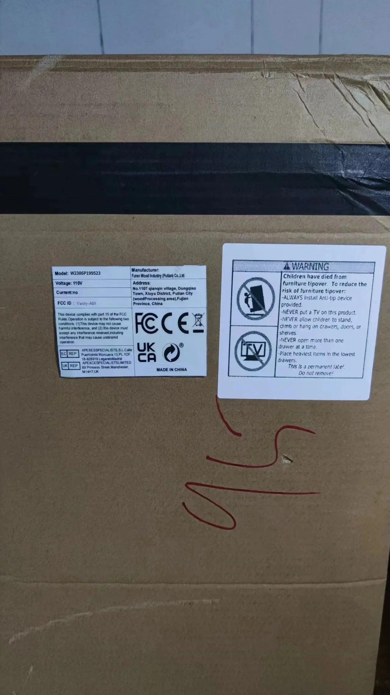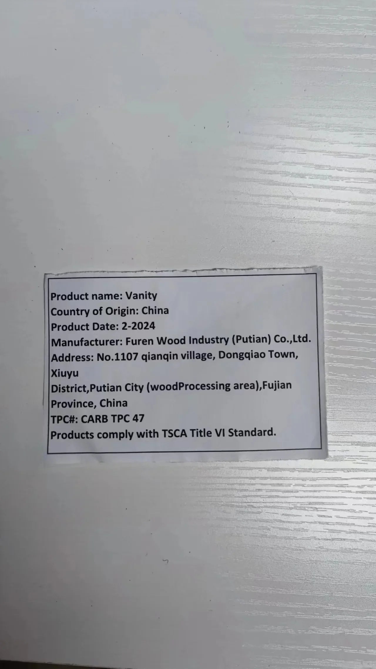 This vanity is made from engineered wood (particle board), a common material for efficient use of wood resources. As with all tall furniture, place the vanity on a level surface and follow standard safety practices — secure to the wall with anti-tip hardware if local regulations or household circumstances require it. Ensure room and doorway clearance before delivery and assembly: compare the assembled width and height above with your entryway and route to the final room.