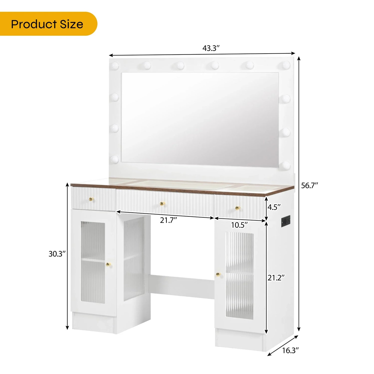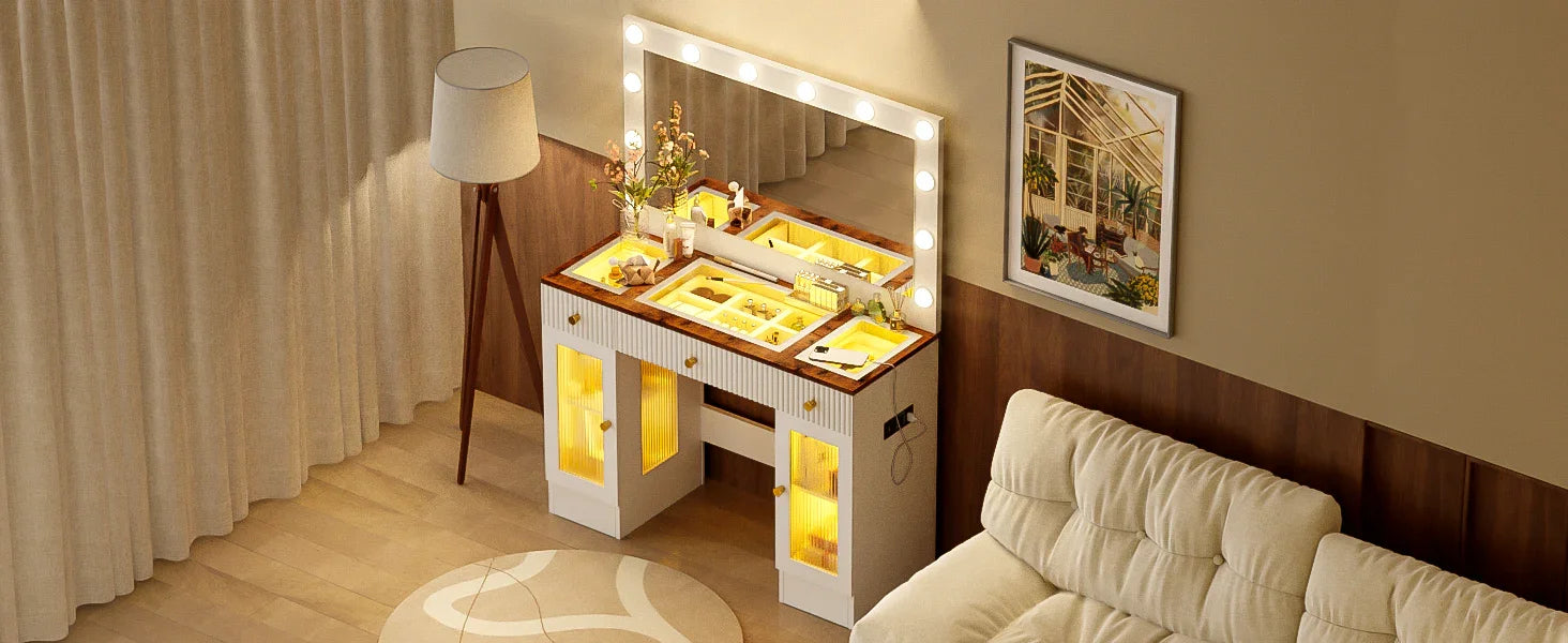 This white vanity desk is made for anyone who wants a salon-style getting-ready station at home — ideal for bedrooms, dressing rooms, or a content-creator corner. The large, lighted mirror with Hollywood-style bulbs provides even, adjustable illumination for makeup, hair and livestreaming, while the tempered glass top and organized compartments keep products visible and within reach.