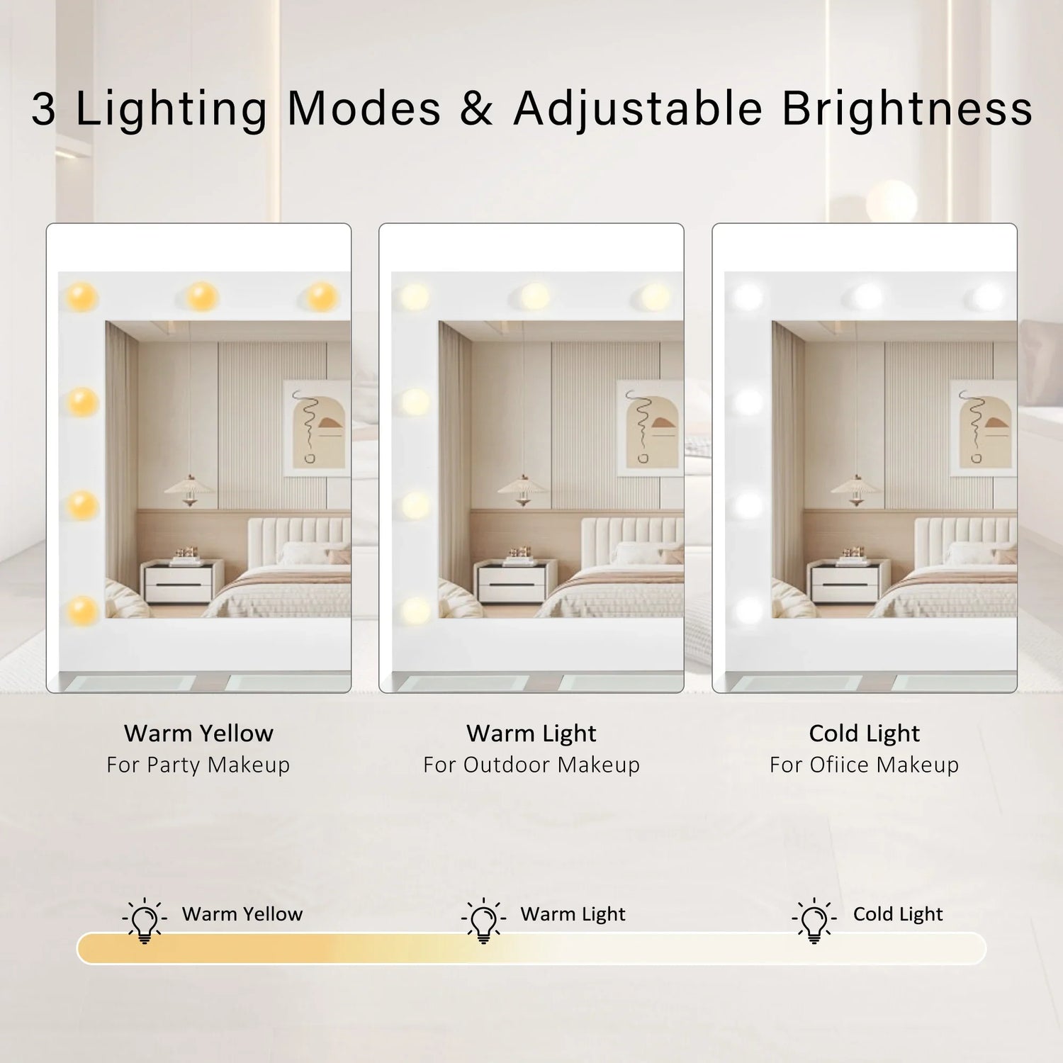- Lighting: Hollywood-style bulbs around the mirror with multi-color lighting modes and adjustable brightness (lighting mode and count vary by model).