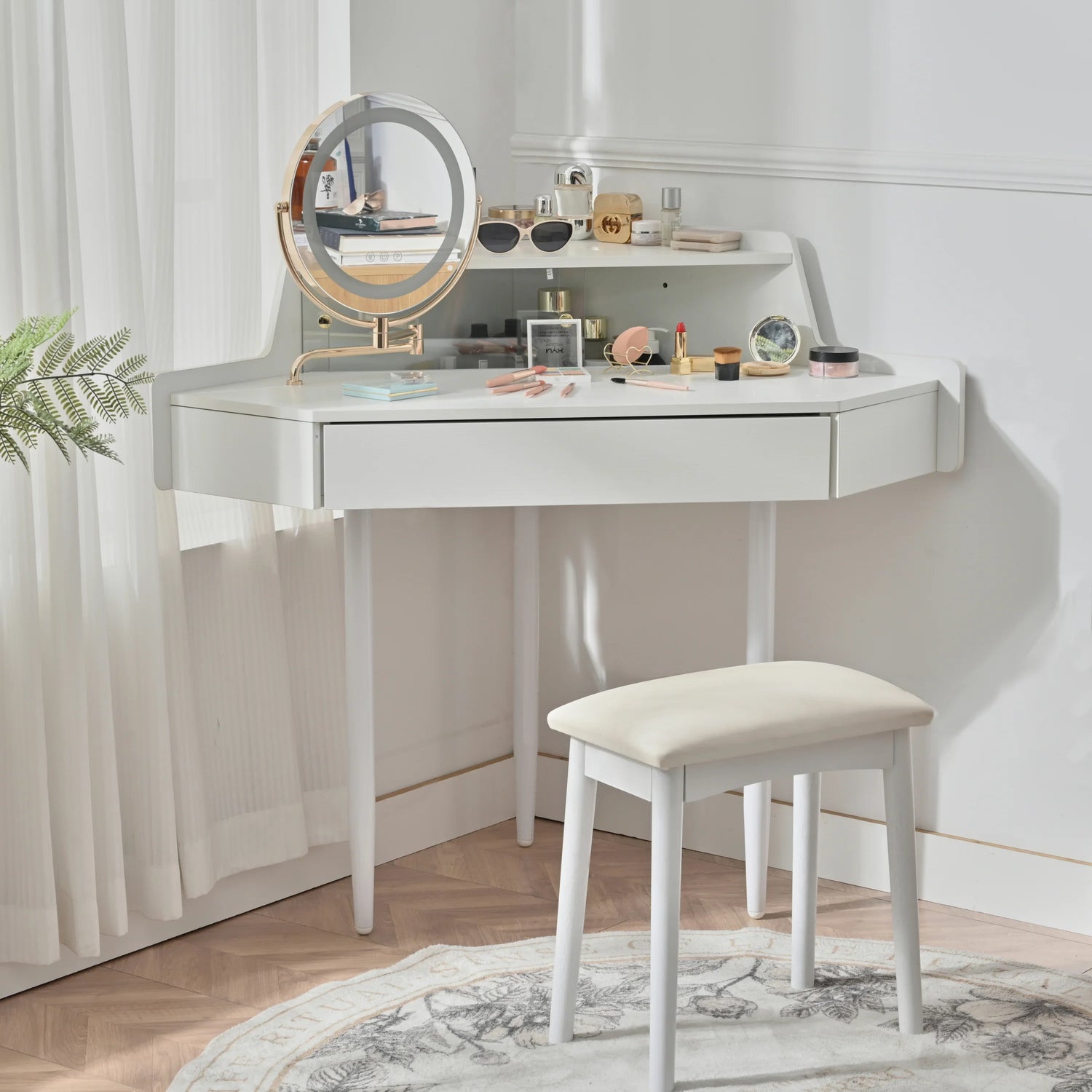 Everyday use is effortless: the engineered wood top resists wear while the included cushioned stool gives comfortable seating for morning routines or evening prep. Visible in the product photos are soft rounded edges, a large surface for styling, and a shallow shelf that keeps perfumes and small items neatly arranged—features that make this vanity both practical and polished for daily life. Product listings for this model also note integrated LED lighting and a rotatable mirror option on some configurations, enhancing usability for makeup and grooming.