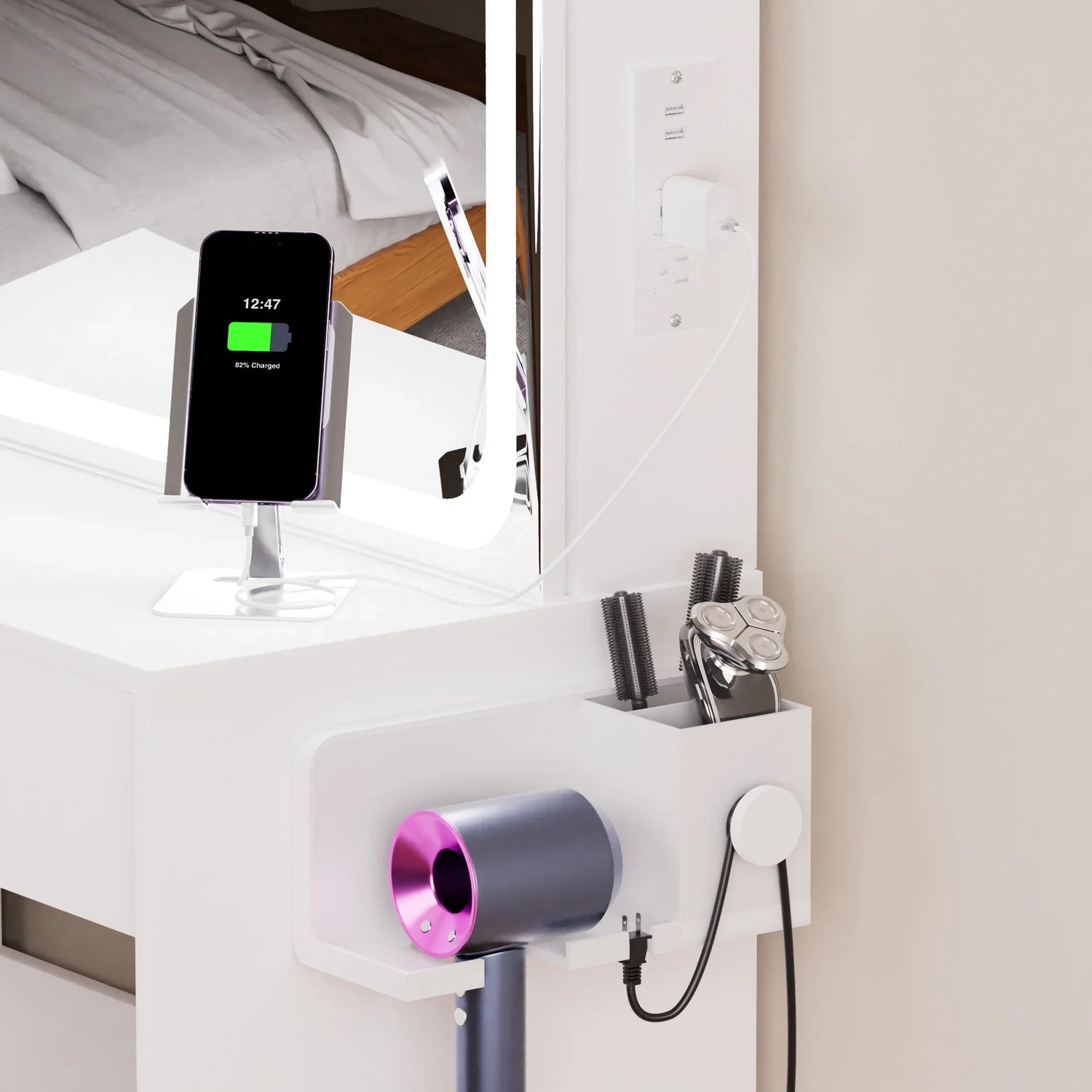 - Power & charging: Built-in charging station (outlets and USB ports included as shown) to power styling tools and charge devices.