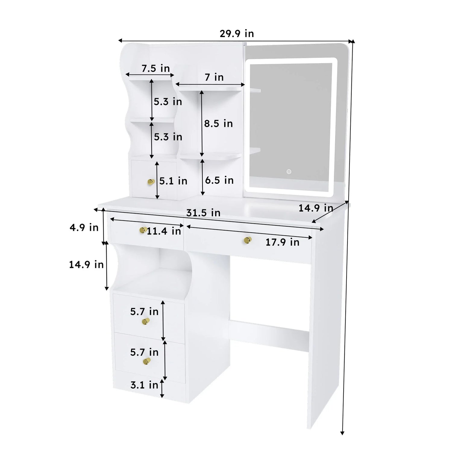 Designed with clean modern lines and subtle curving shelf accents, the vanity blends practical organization with refined styling—white lacquer-like finish, brass-tone knob hardware, and open cubbies create a bright, easy-to-style focal point. The mirror offers three color modes and adjustable brightness so you can tailor lighting to natural, warm, or cool makeup conditions.