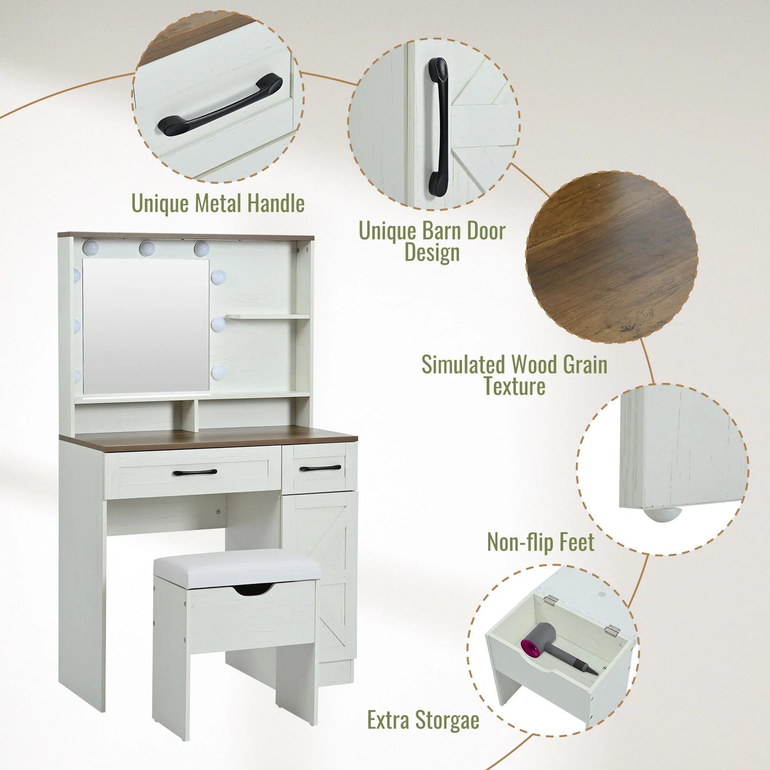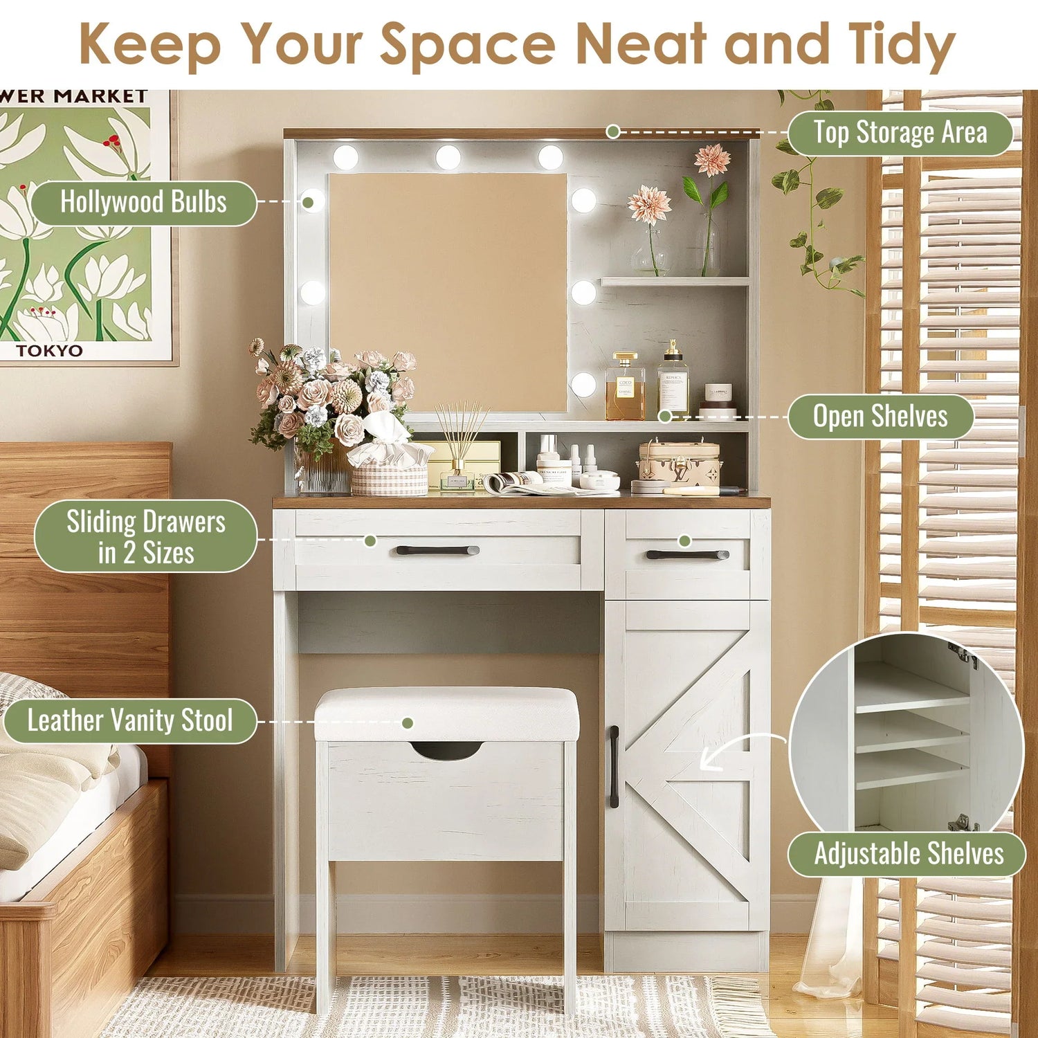 Farmhouse Makeup Vanity Desk With Mirror And Lights, 3 Lighting Modes, Vanity Set With Stool, Dressing Table With Adjustable Shelves, 2 Drawers And Side Cabinet For Bedroom - White