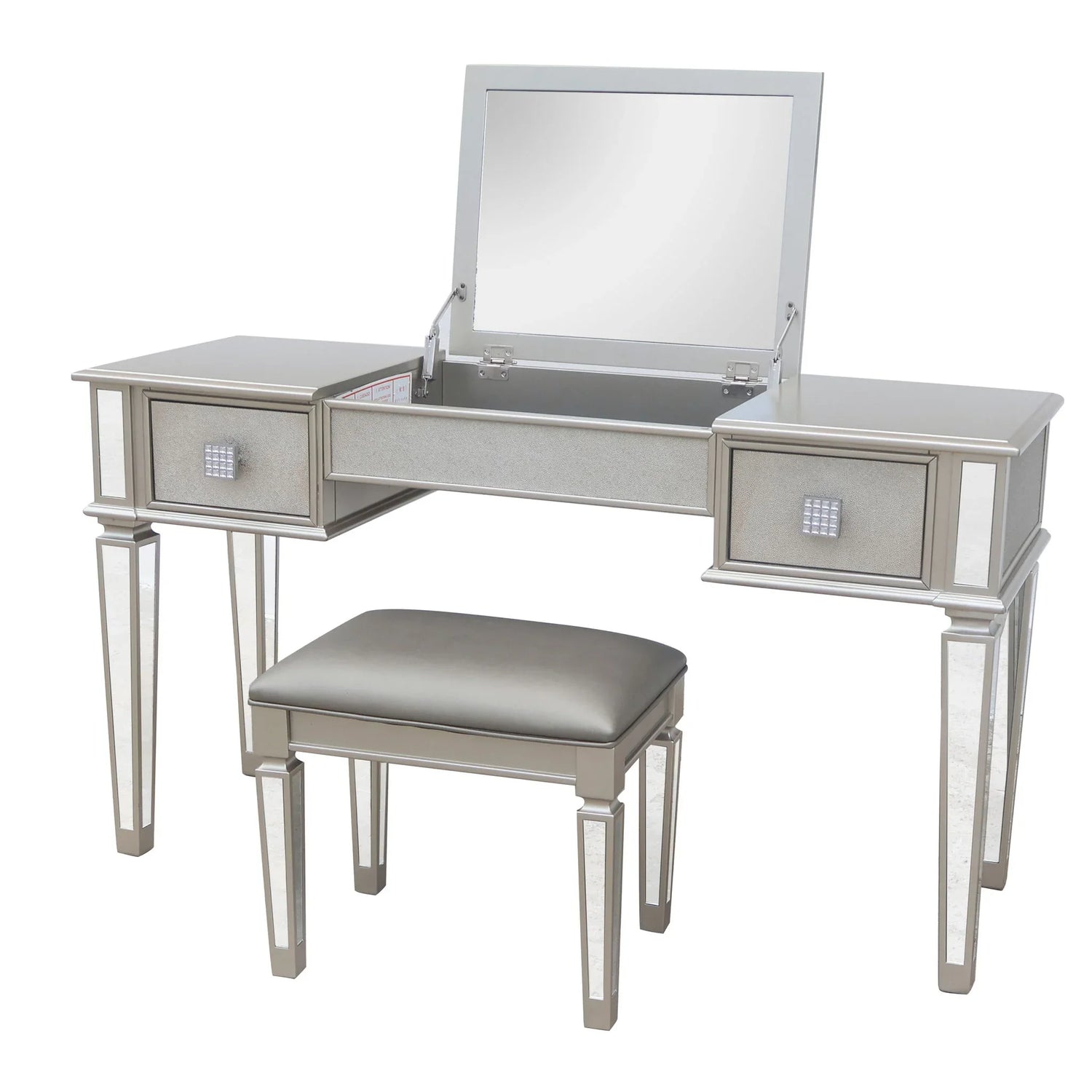 Mirrored Vanity Desk With Drawers And Stool, Flip Up Dressing Table Set For Makeup Room, And Glass Construction - Silver