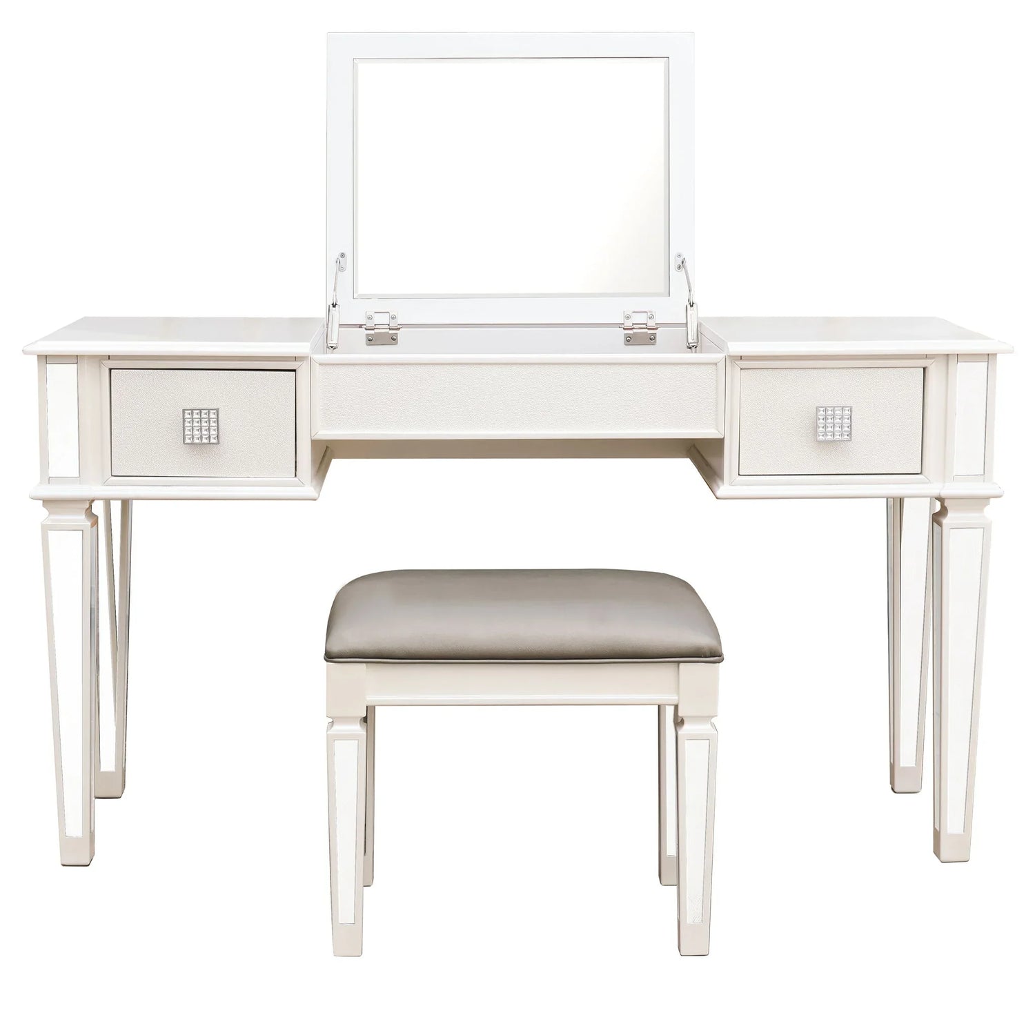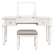 Elegant Mirrored Vanity Desk Set With Drawers And Flip Up Mirror, Silver Finish, Glass And Wood - White