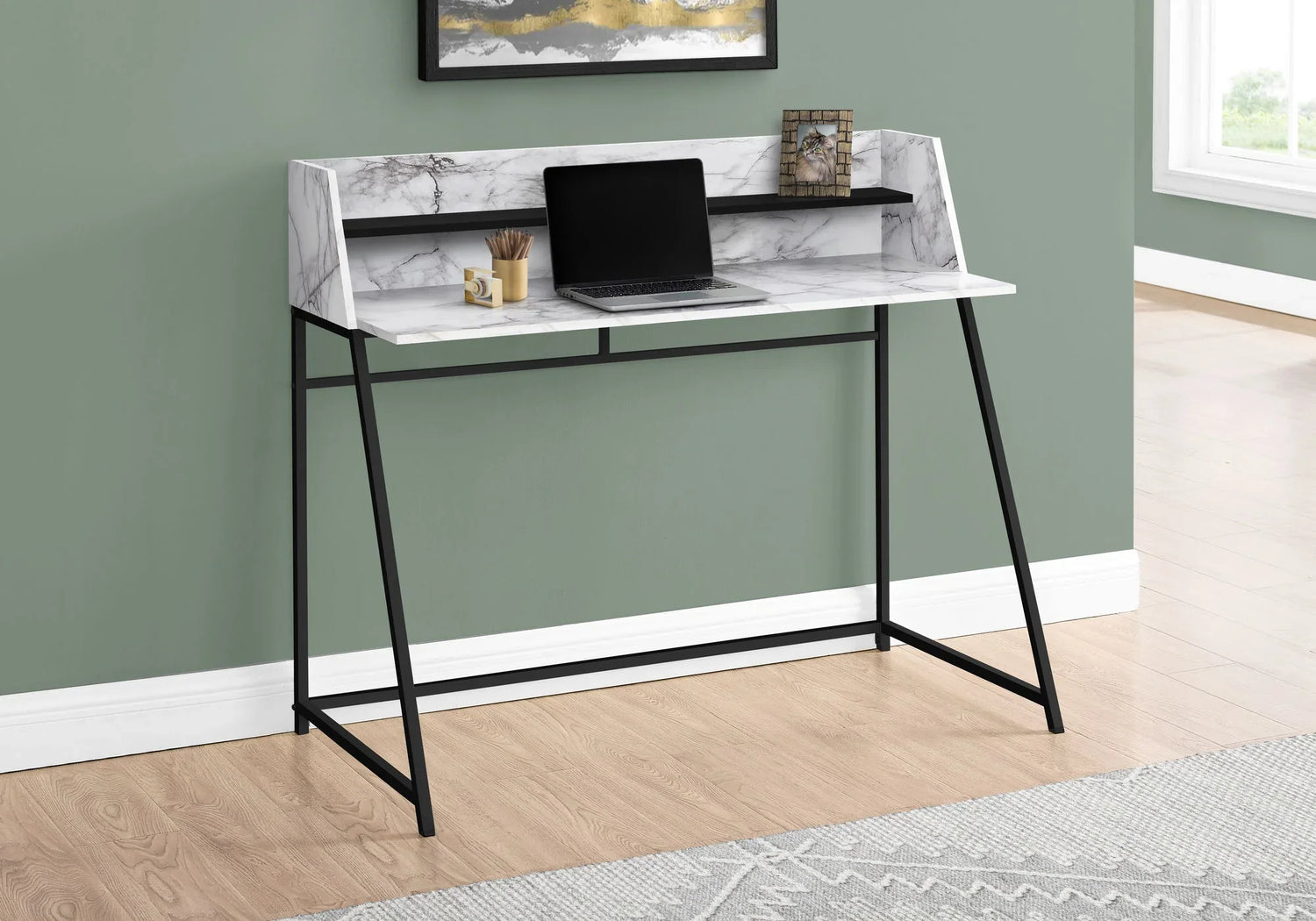 - Stylish Design: The computer desk features a marble-look finish with a small hutch and a long shelf in a contrasting finish, adding a modern touch to your home office.