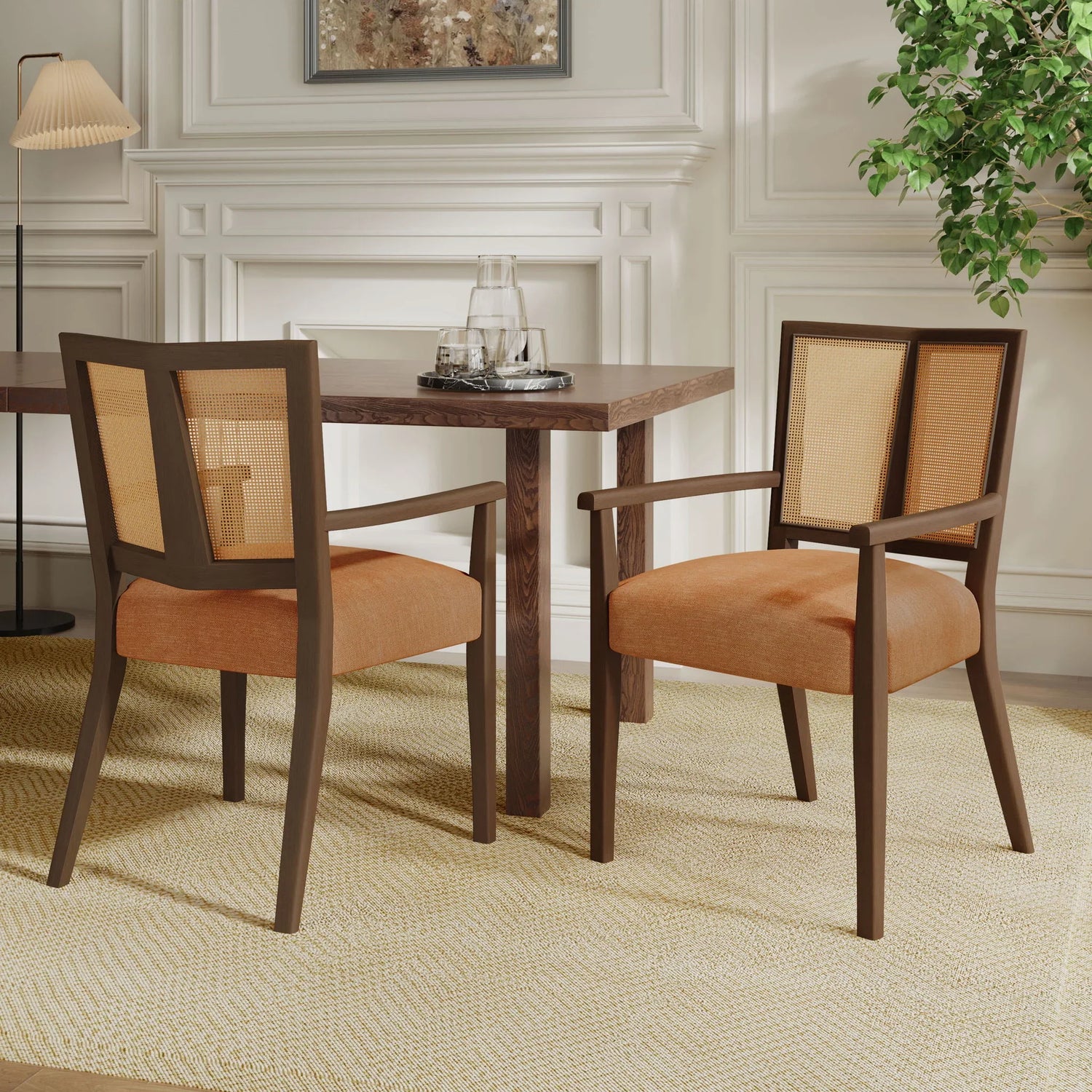 Mid Century Modern Arm Dining Chair (Set of 2) With Rattan Backrest - Caramel / Walnut