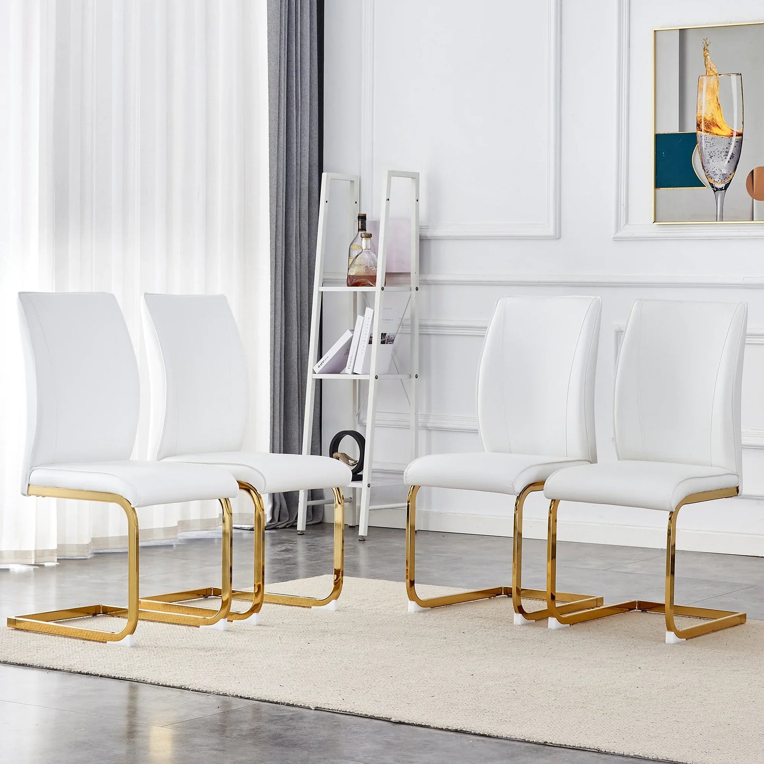 Perfect for modern dining rooms and compact open-plan kitchens, this set of four dining chairs blends clean, contemporary lines with a touch of luxe. The white upholstered seats and curved backs create a comfortable, supportive profile for everyday meals and longer dinners, while the polished gold metal frame lifts the look to something more refined — ideal for homeowners looking for a streamlined, hotel-inspired aesthetic.