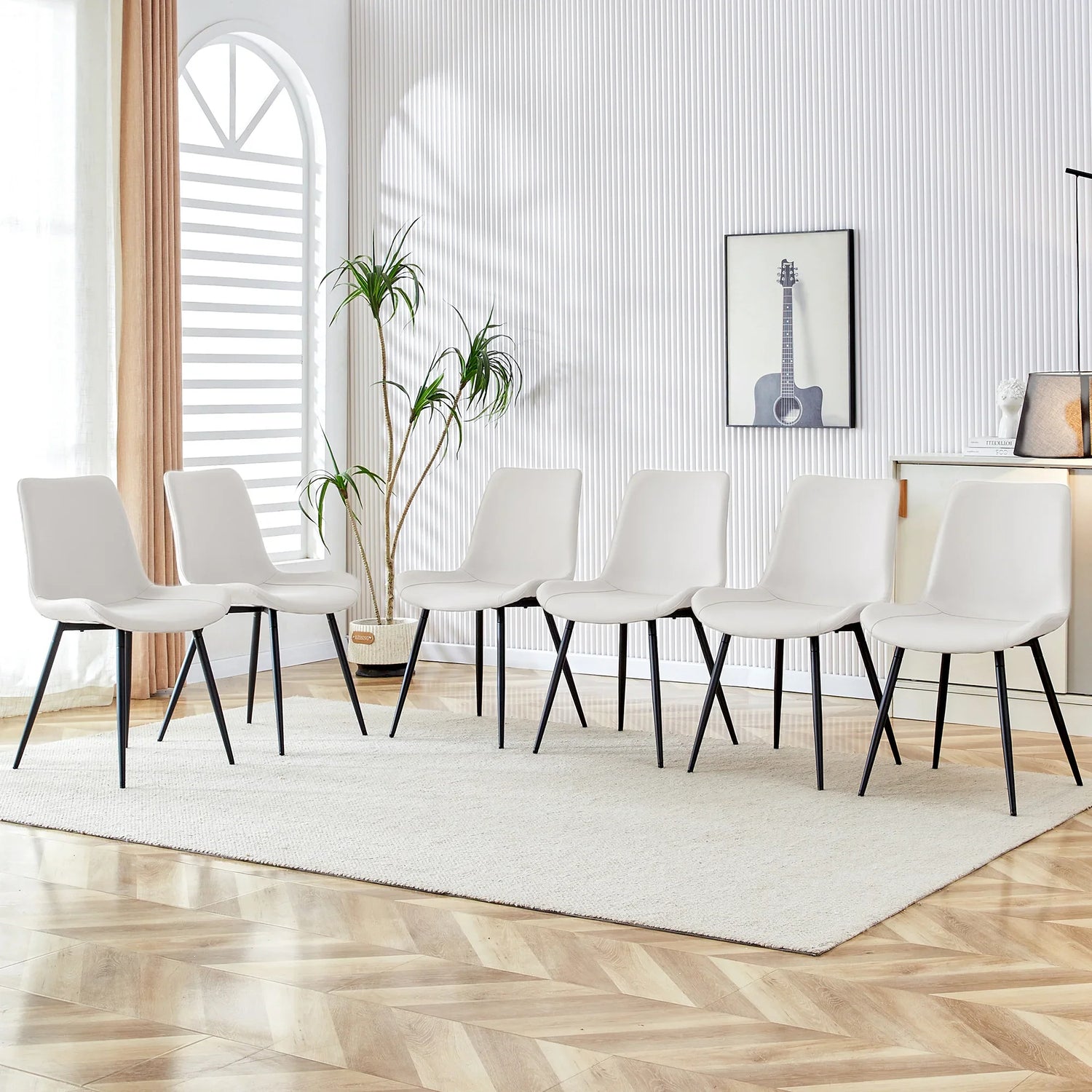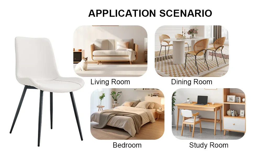 - White artificial leather backrest cushion dining chair, black metal legs, curved widened cushion design for more comfort, suitable for restaurants, kitchens, bedrooms, offices.