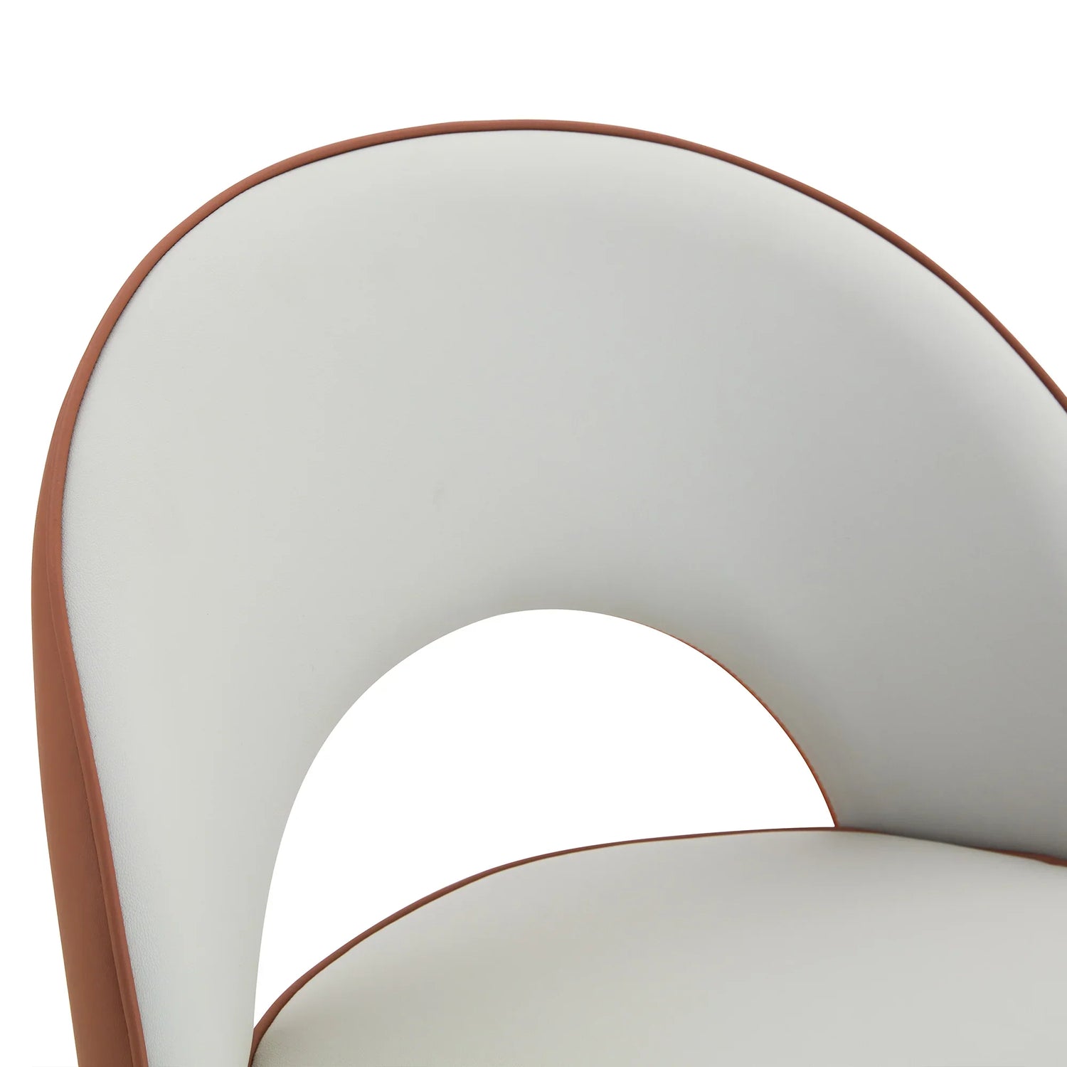 - Finish & color notes: Matte black legs with gold-tone foot ring and leg caps; warm brown outer upholstery with light‑gray inner seating surface. Natural variation in leatherette grain and screen color is normal.