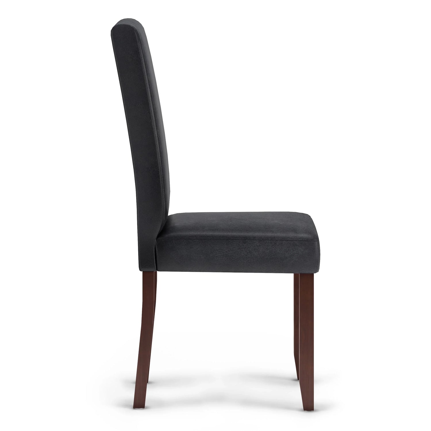 Simple, sculpted and built for everyday use, the Acadian Parson Dining Chair (set of 2) is a versatile choice for modern dining rooms, kitchens, home offices or casual sitting areas. The tall, clean-lined silhouette and slightly tapered wooden legs create a timeless profile that pairs easily with contemporary or transitional tables. Upholstered in a durable distressed black vegan faux leather, these chairs give the look of aged leather with easy-care performance.