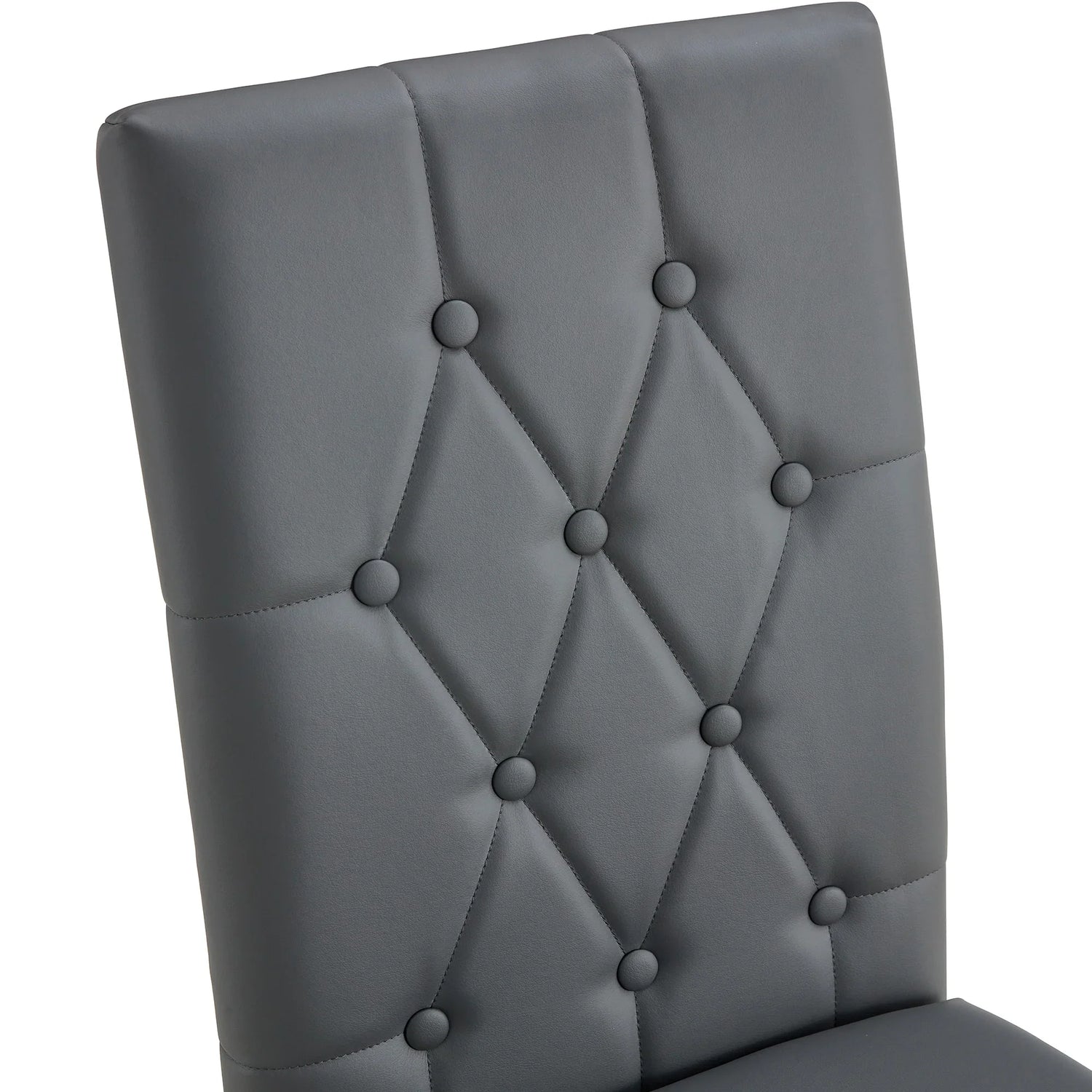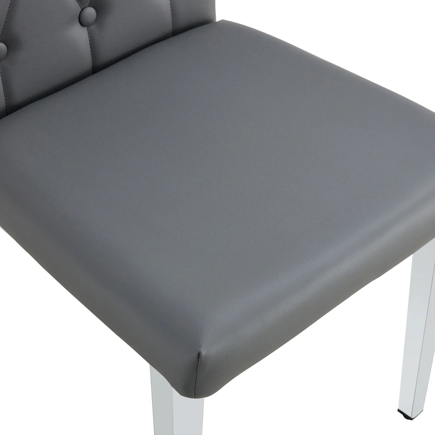 Upholstered in smooth gray PU with button-tufted detail and mounted on polished silver metal legs, each chair balances easy care with a refined silhouette. The slim-profile frame keeps the set visually light while durable metal legs provide steady support for regular use—an elegant, practical choice for contemporary dining spaces.