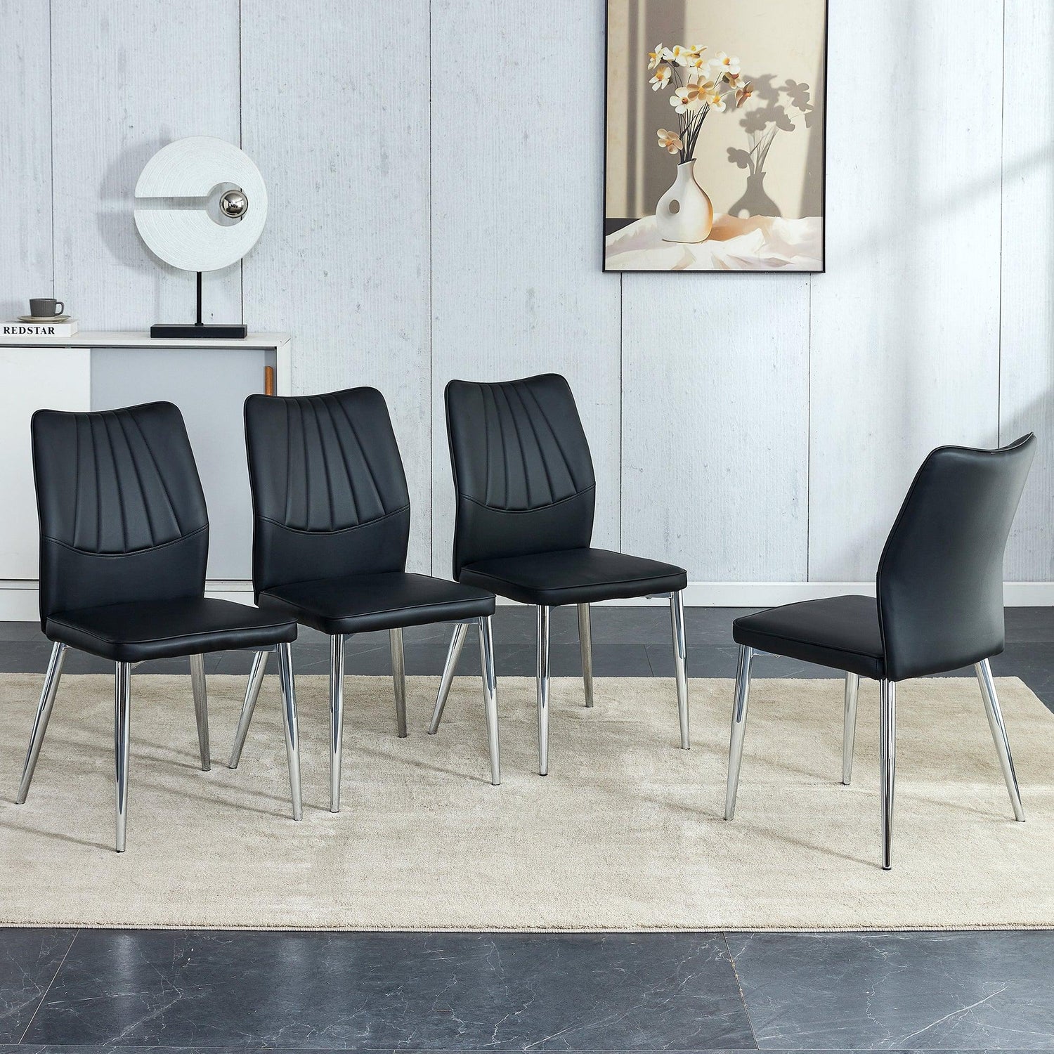 Upholstered in smooth black PU with vertical channel stitching and supported by polished metal legs, this set reads contemporary with a subtle mid-century influence. The PU has a low-sheen, cool-black finish that’s easy to wipe clean, while the chrome-like metal legs add visual lightness and a reflective accent to modern interiors. Natural variations in lighting and screen settings may slightly affect how the black appears in your room.