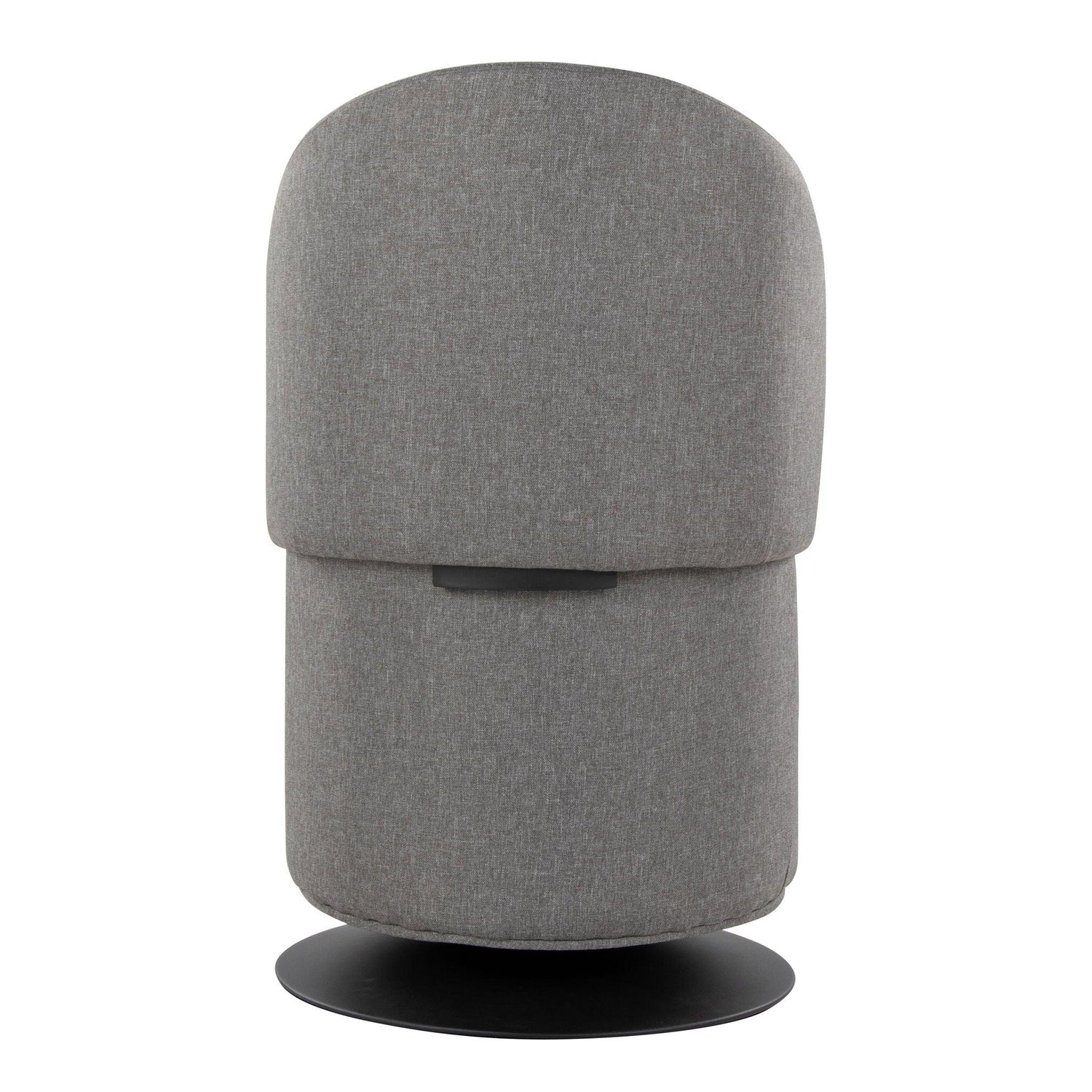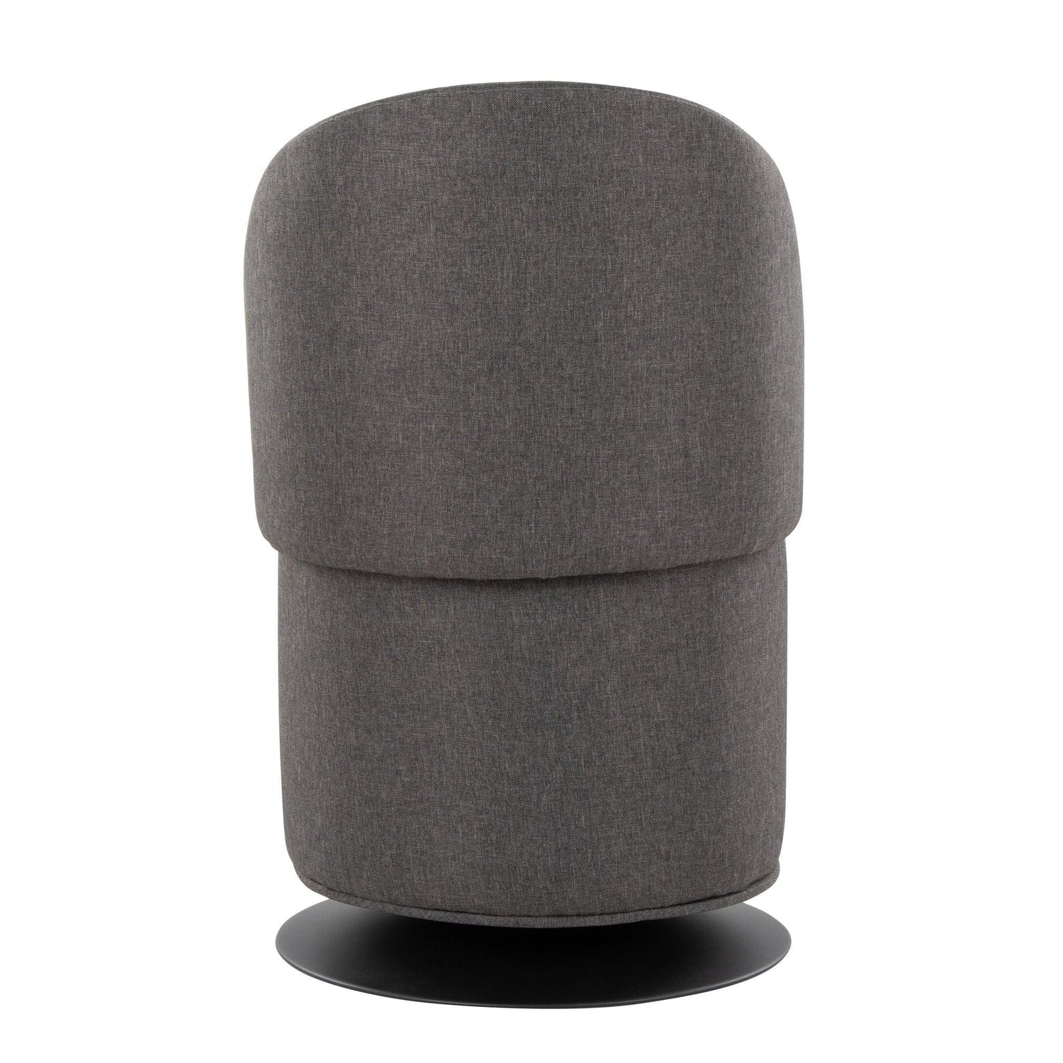 - Materials: Upholstered fabric shell with foam seating; round metal swivel base.