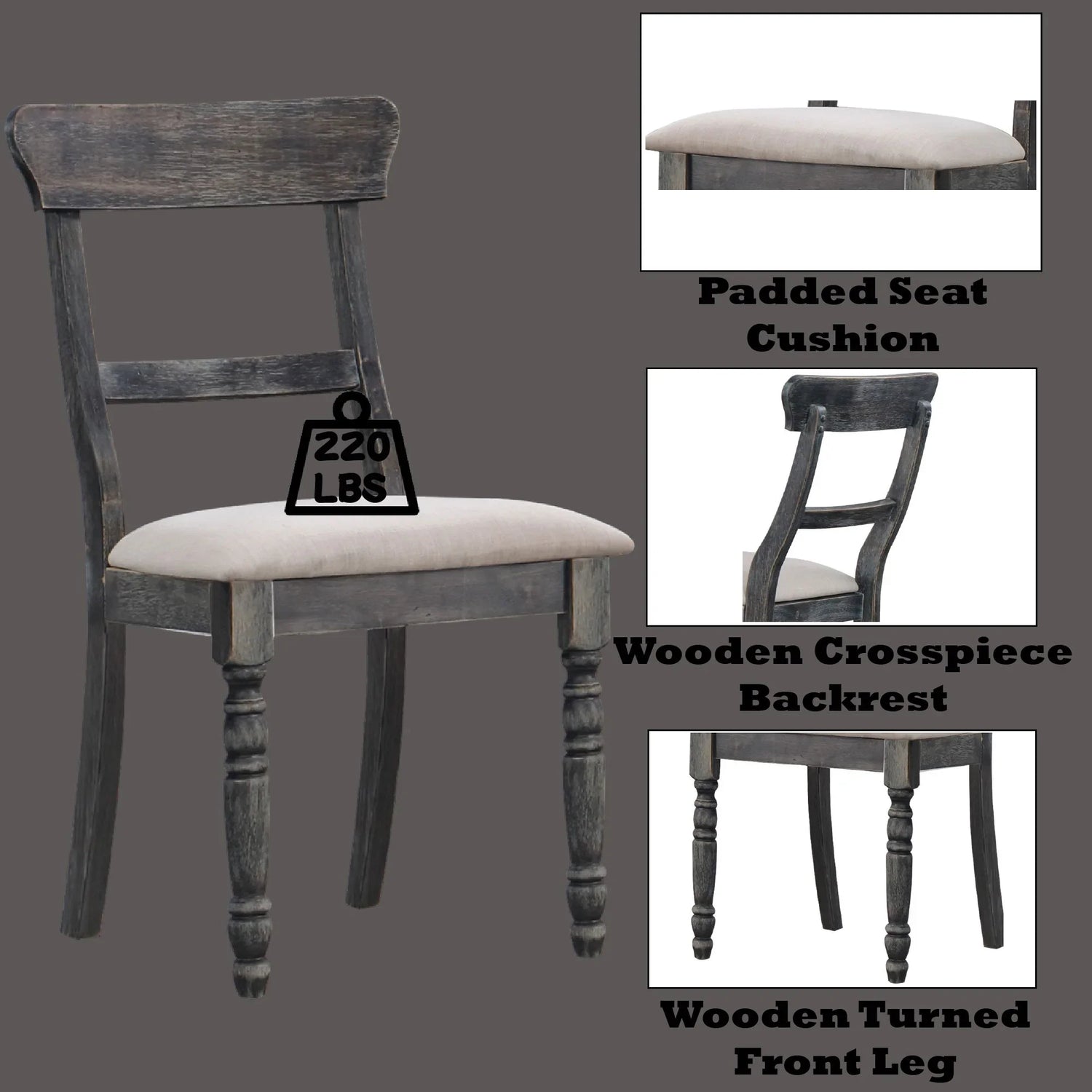- Frame & finish: Weathered gray solid wood frame and legs with a lightly distressed, matte-to-satin appearance that highlights wood grain and carved details.