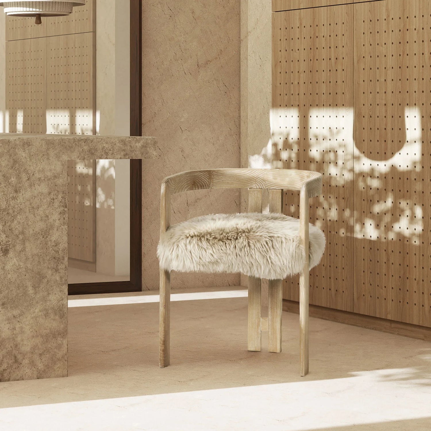 - High-Quality Materials: The chair features a solid ash wood frame with a beautiful natural grain, finished in a blonde rustic tone. The seat is upholstered in genuine sheepskin fur, providing a luxurious and comfortable seating experience.