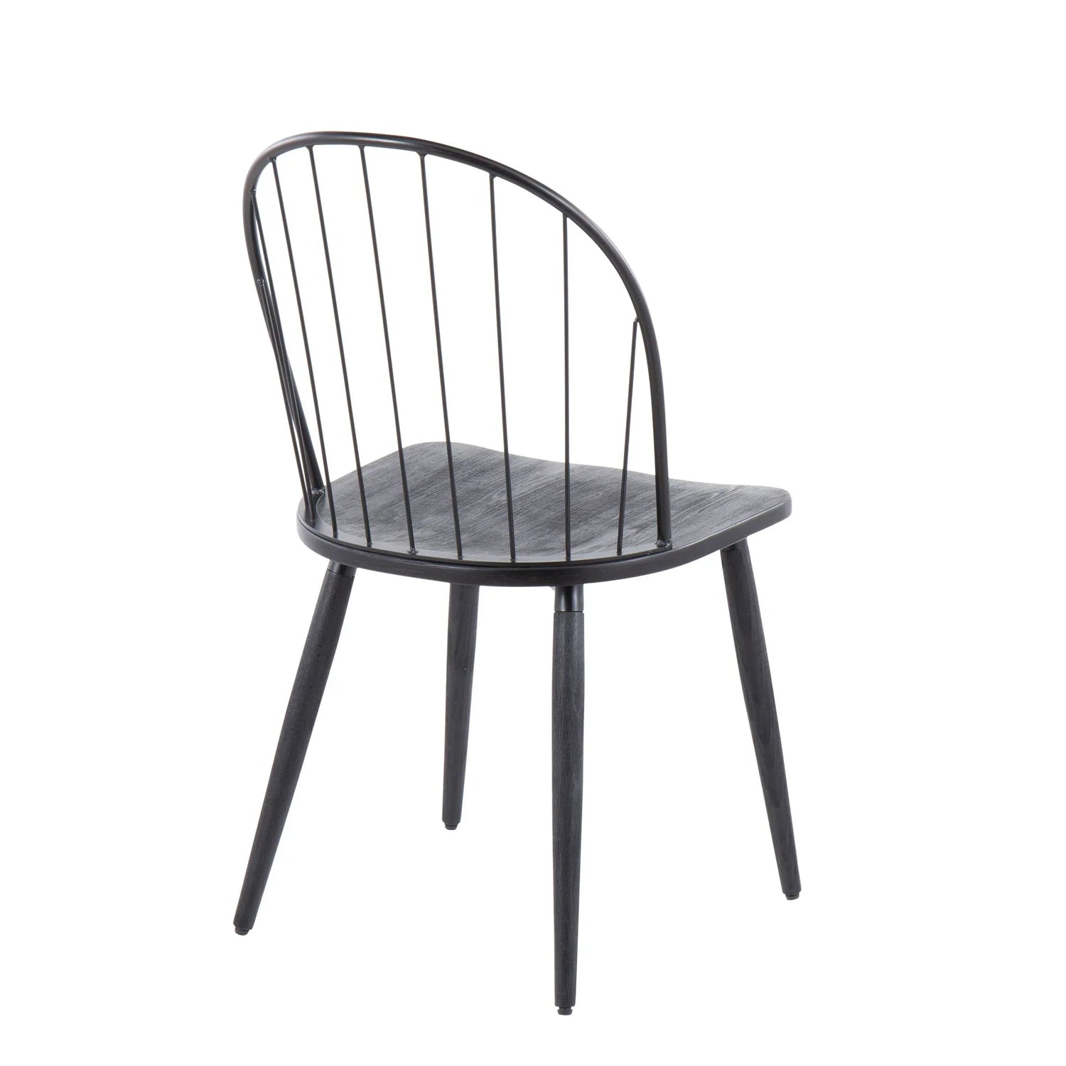 Construction & materials: Wood seat with a visible woodgrain texture; slender steel spindle back and steel legs finished in black.