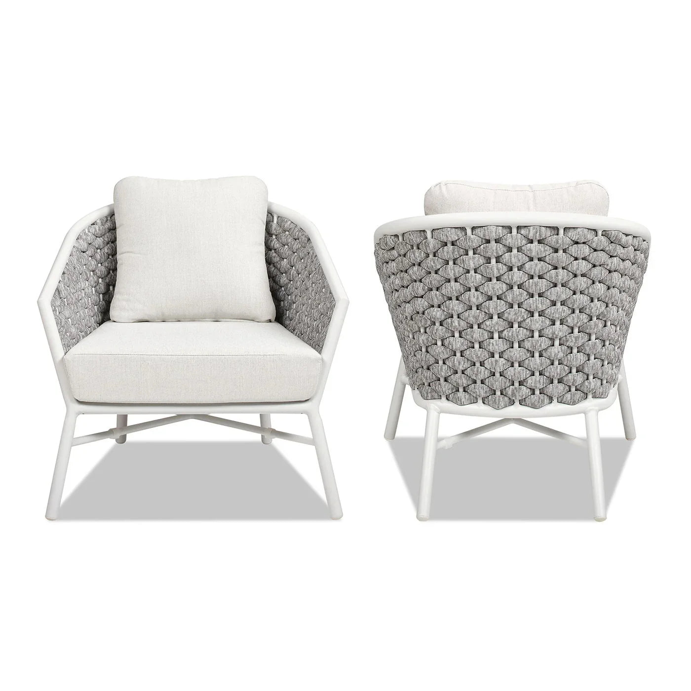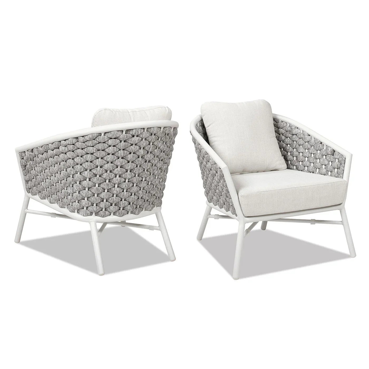 Designed for outdoor use, the chairs pair a powder‑coated aluminum frame with weather‑resistant acrylic upholstery and textured rope detailing for lasting comfort and easy upkeep. Cushions are removable for spot cleaning, and the semi‑firm seat offers supportive day‑to‑day comfort—so these chairs look intentional on a terrace and perform through seasons of use.