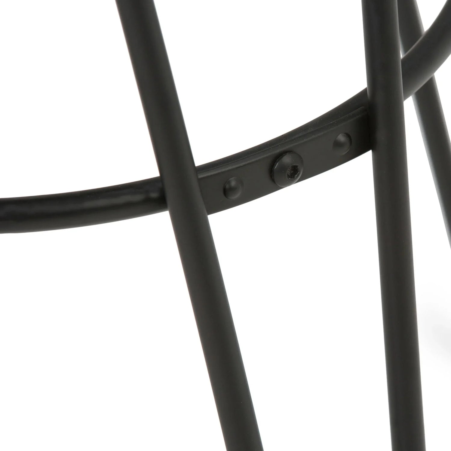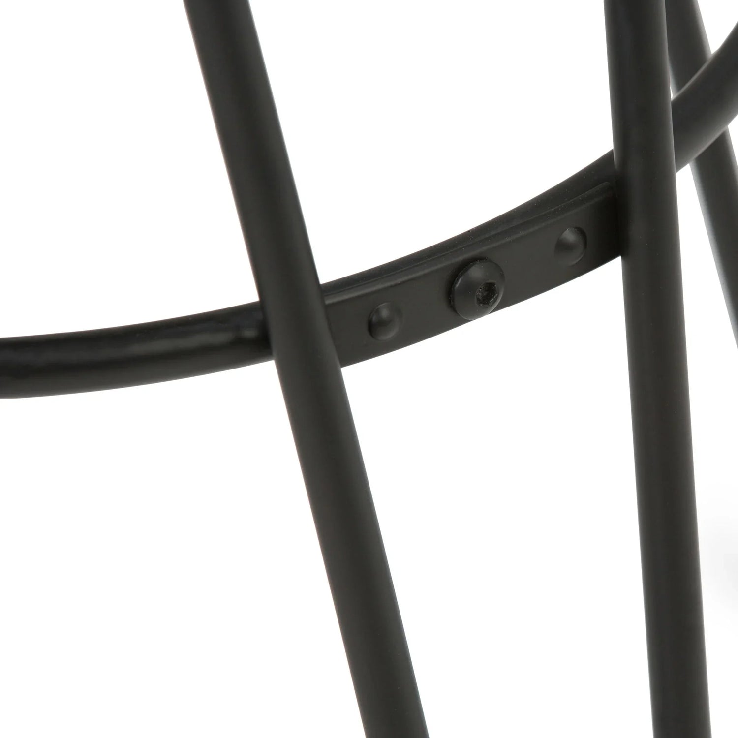 Day-to-day the Simeon performs like a workhorse: a comfortably contoured wooden top for short- to medium-length sitting, an integrated circular footrest for stability, and powder-coated iron legs that tuck neatly beneath counters when not in use. The seat is hand-finished from solid elm (sustainably sourced), and the hairpin legs are finished in a matte black that complements modern, industrial, and rustic interiors.