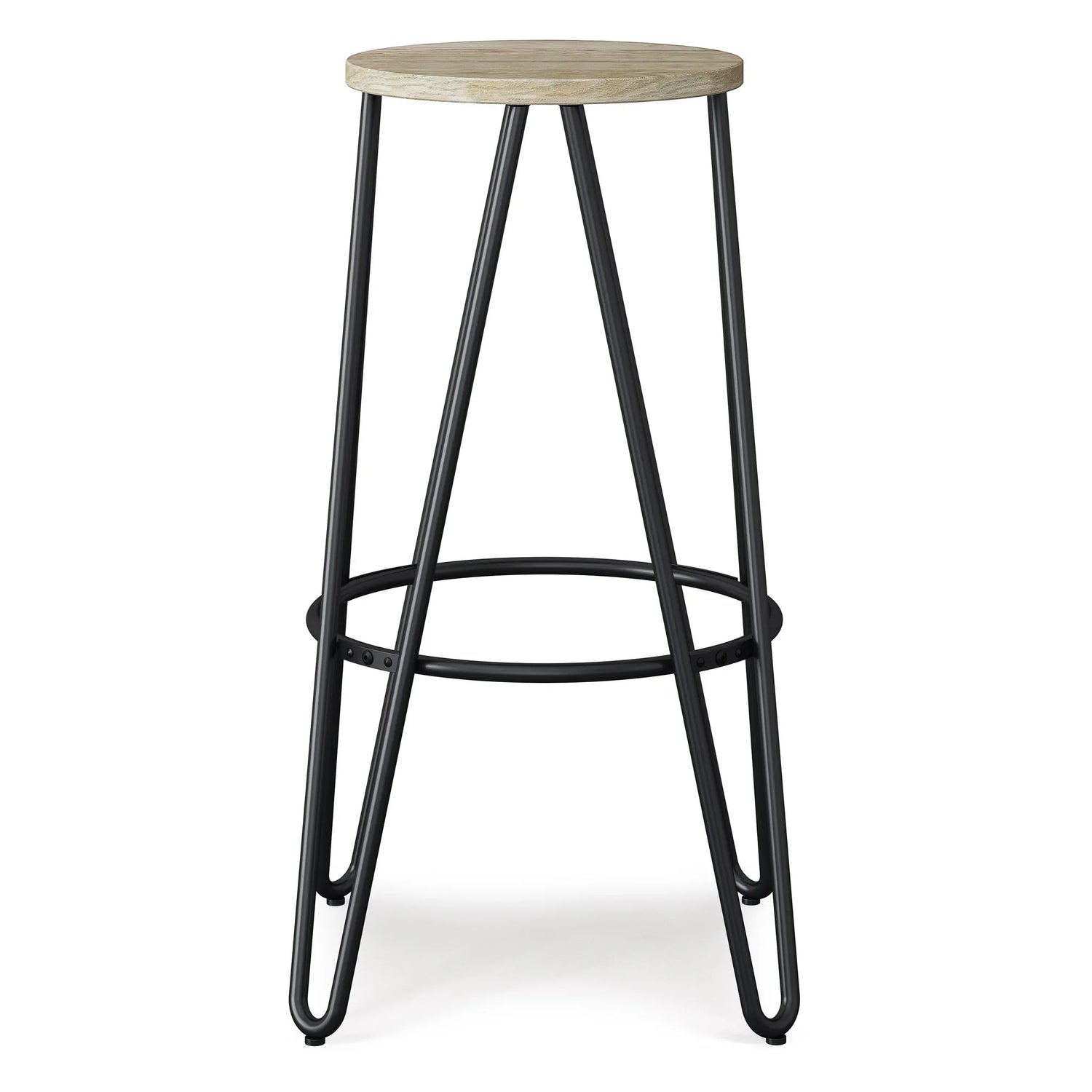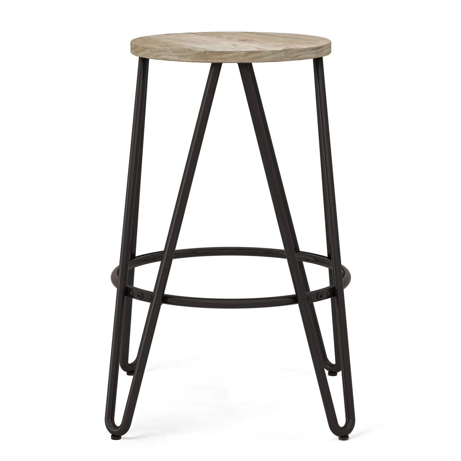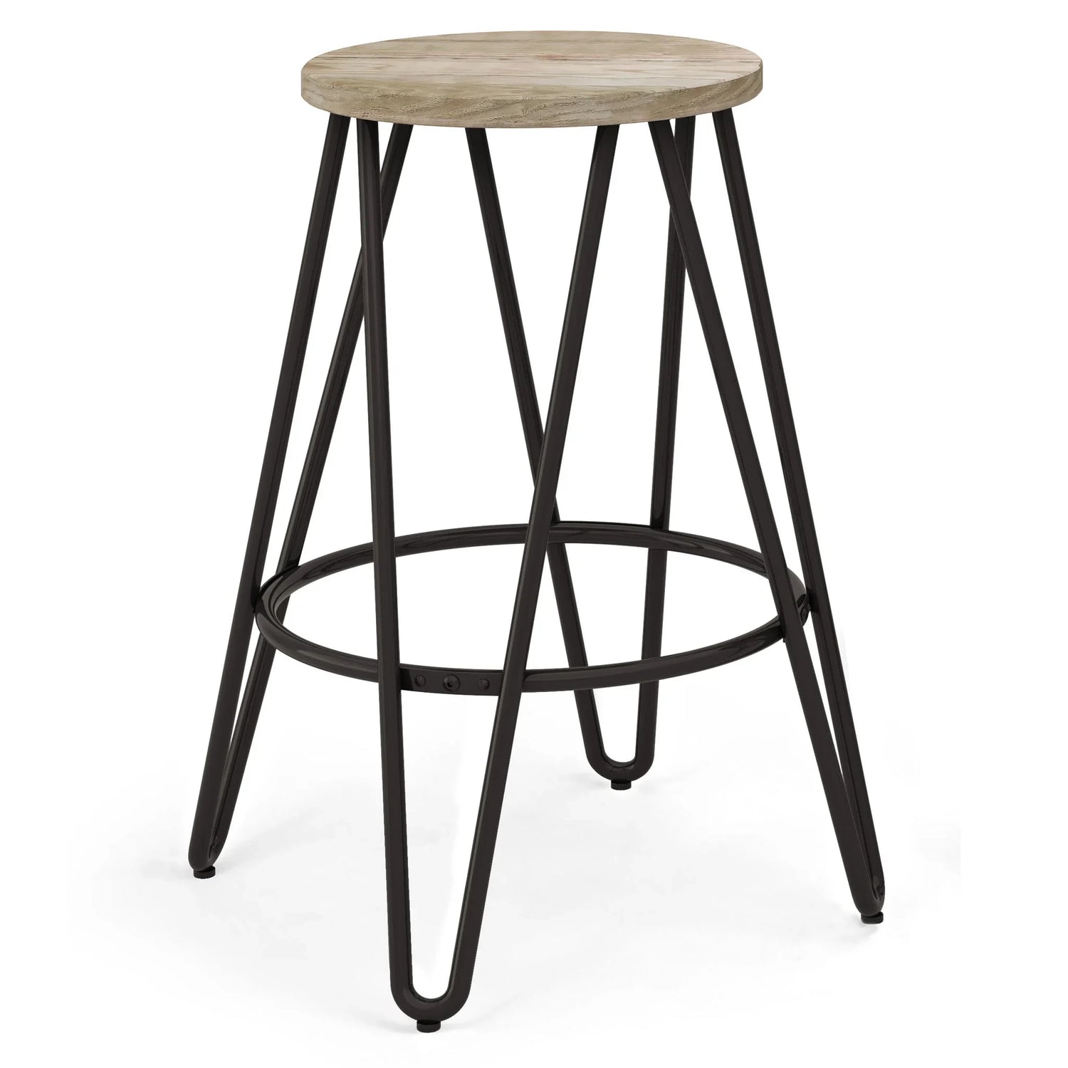 The Simeon stool is made for urban kitchens, casual bars, and compact dining nooks where durable materials and simple industrial style matter. Its round, solid elm seat and slim hairpin iron base make it an easy fit under a counter or around a breakfast bar—ideal for renters, small-family homes, and condo living where a lightweight, multifunctional seat is useful every day.