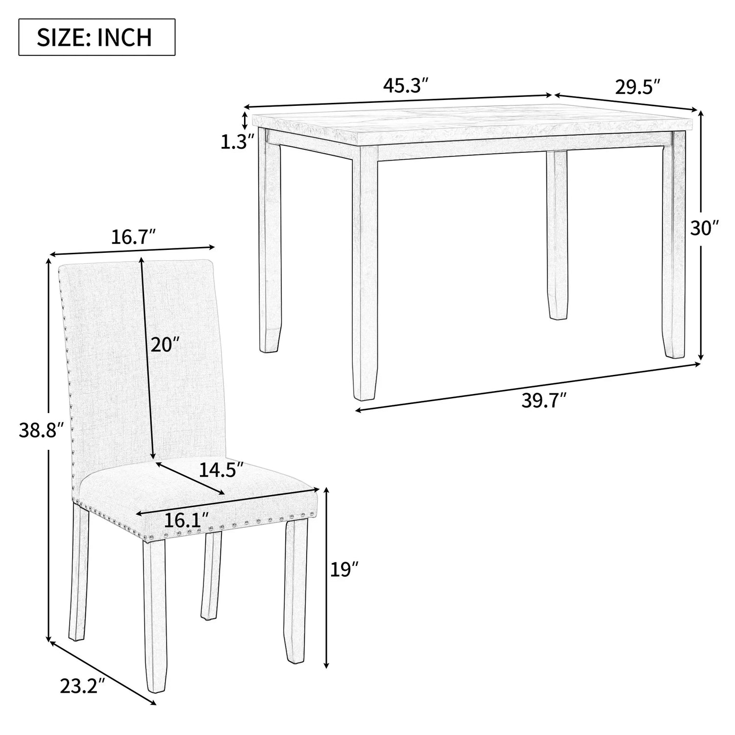 Built for everyday family meals and small‑space dining, this 5‑piece dining set brings modern polish to kitchens, breakfast nooks, and compact dining rooms. The rectangular faux‑marble tabletop pairs with a sturdy rubberwood frame and black‑finished legs for a contemporary contrast that reads fresh against neutral palettes. Four cushioned chairs with tall backs create a relaxed, upright seat perfect for weekday dinners and weekend gatherings.