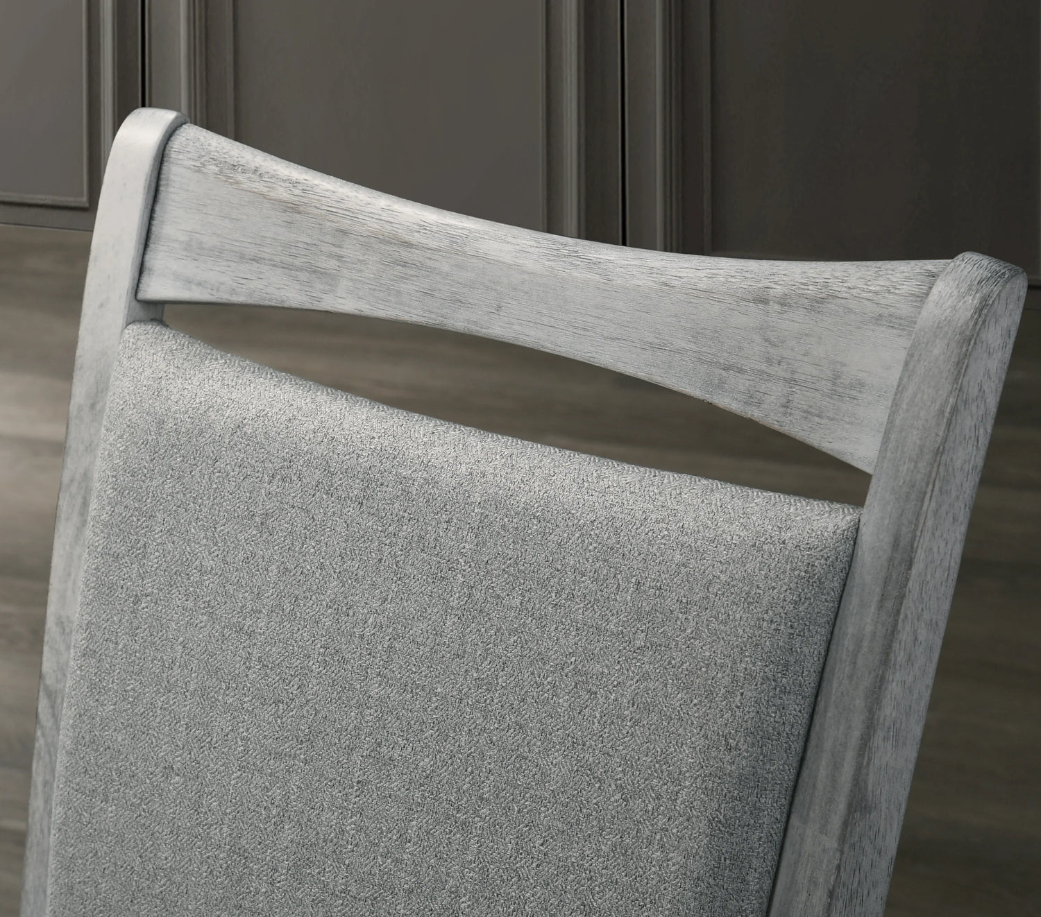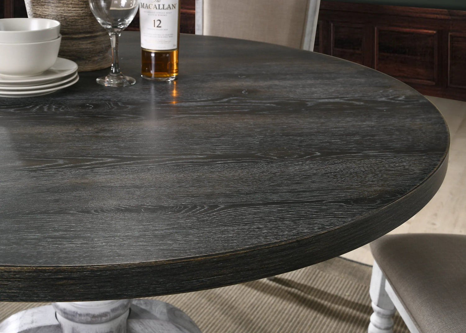 This five-piece round pedestal dining set is for households that want a warm, lived-in farmhouse look without sacrificing everyday comfort. Sized for casual family meals and small dinner parties, the set fits naturally in a kitchen nook or a medium dining room and seats four people comfortably. The weathered white frame and darker wood tabletop create a relaxed, layered aesthetic that pairs easily with both neutral and modern farmhouse decor.