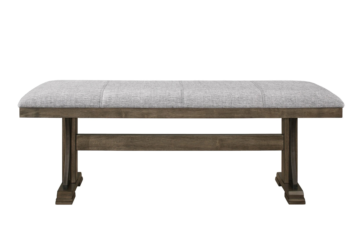 Everyday-friendly and grounded in solid visual detail, the set pairs a distressed antique brown wood finish with soft, light‑tone upholstery on the bench and chairs for a balanced contrast. The trestle base and supportive chair backs give the group a durable, family-ready feel while the upholstered seats add comfort for long dinners or homework sessions at the table.