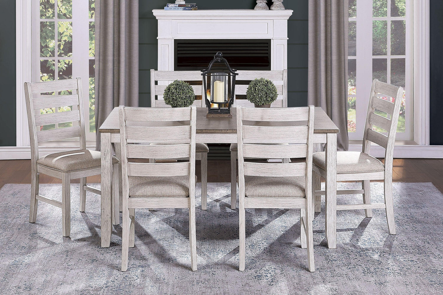 Designed for everyday family meals and relaxed dinner parties, this 7-piece rustic dining set brings casual, coastal-inspired charm to a transitional dining room. The rectangular table and six ladder-back chairs fit neatly in medium to large dining spaces and are crafted to feel lived-in — ideal for households that want a warm, welcoming table without formal fuss.