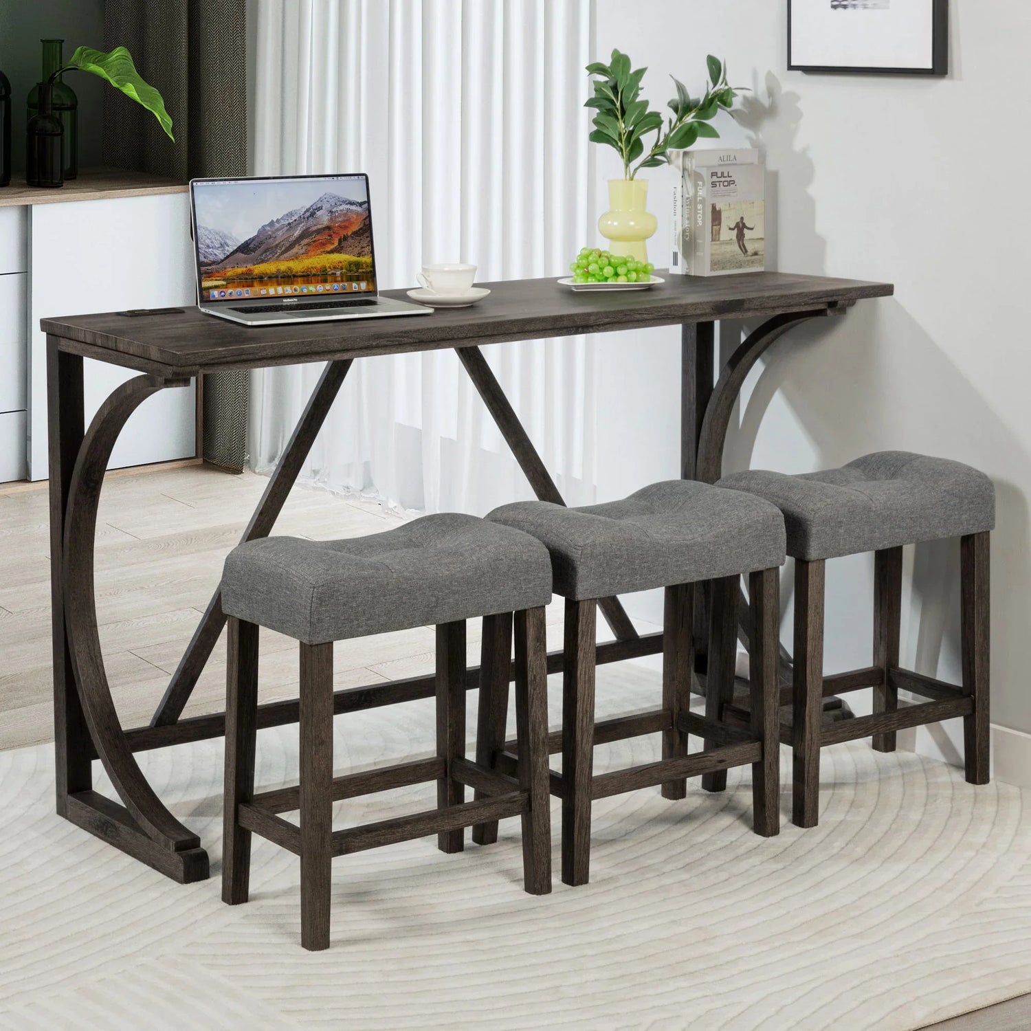 Built for everyday use, the set pairs a faux wood–grain table surface and bentwood curved supports with sturdy rubberwood legs for dependable stability. The tabletop includes an integrated power strip with USB and Type‑C charging ports so devices stay powered during work-from-home sessions or long dinners. The tufted, padded stools feature a neutral, linen‑look upholstery that complements the warm rustic finish and softens the overall silhouette.