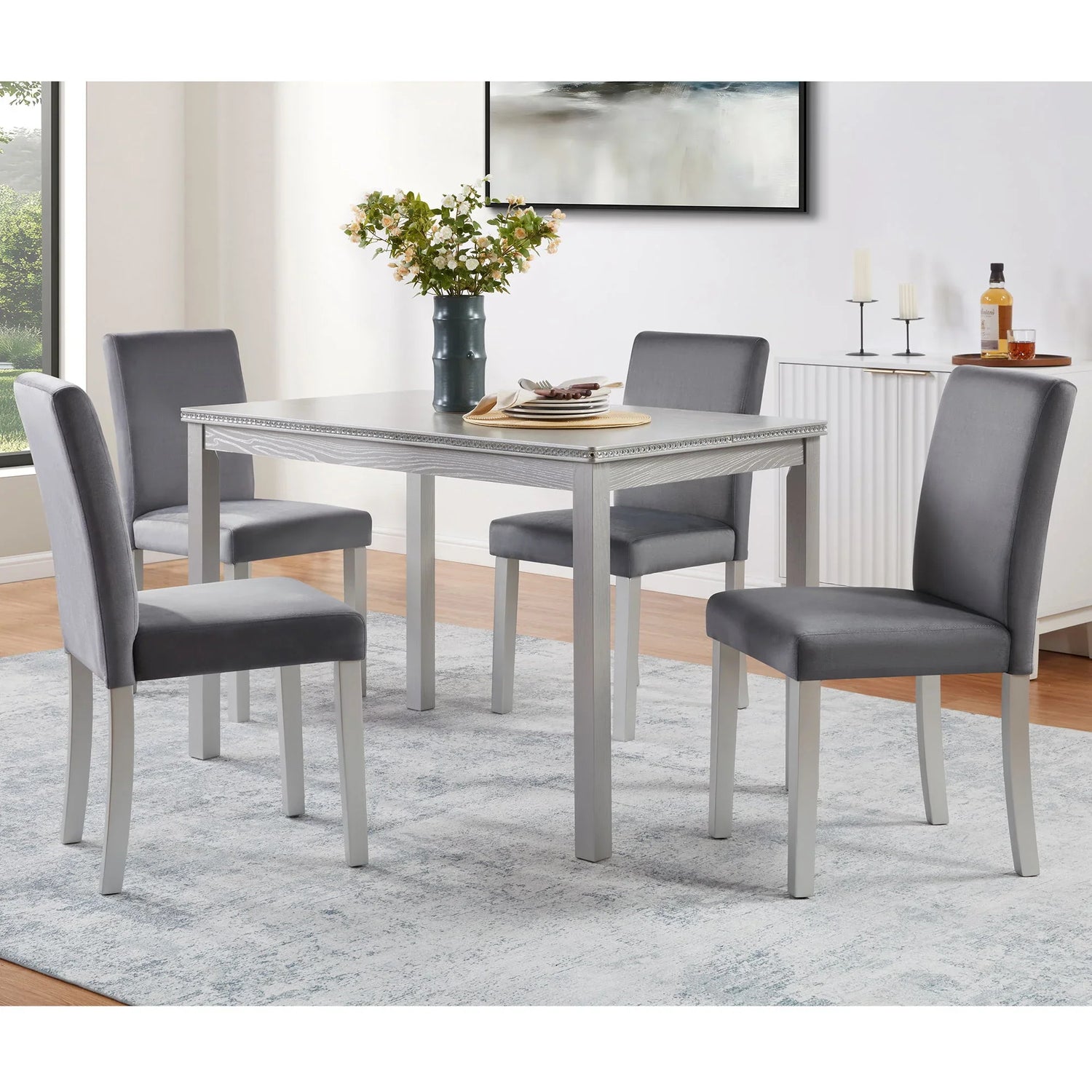 5 Pieces Wooden Dining Table Set, Kitchen Table Set With A Rectangular Table And 4 Upholstered Chairs - Silver Gray